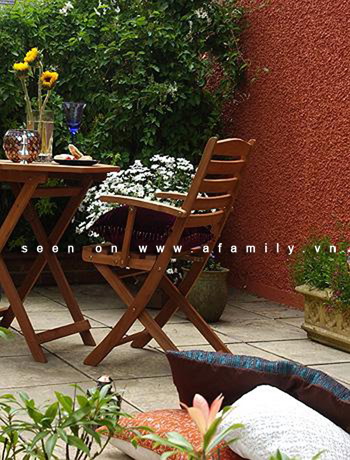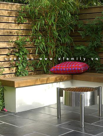 Nếu sân vườn nhỏ thì tốt nhất là bạn nên đơn giản hóa nó đến mức tối đa, bởi lẽ khi bạn càng trang trí nhiều sẽ làm nó càng rối thêm. Những bề mặt hiện đại mà đá, gỗ, kim loại láng bóng như hình trên sẽ khiến cho diện tích nhỏ của bạn trở nên bóng bẩy và tạo cảm giác rộng rãi hơn. Một khu vườn nhỏ gọn với băng ghế màu trắng và chỗ ngồi bằng gỗ sơn dầu, thêm khóm cây xanh càng thêm phần dịu mát…