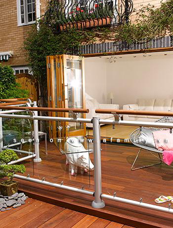 Bạn thấy không, một mặt sàn lát gỗ trông thật bóng láng và hiện đại, một hệ thống lan can bằng kính tạo nên cảm giác rộng rãi của không gian, những tấm kính hiện đại tương thích với mặt sàn mà không khuất lấp ánh mặt trời, mặt bàn cũng được thiết kế trong suốt… Ai bảo rằng vườn nhỏ thì không có chỗ để thư giãn đúng không nào?