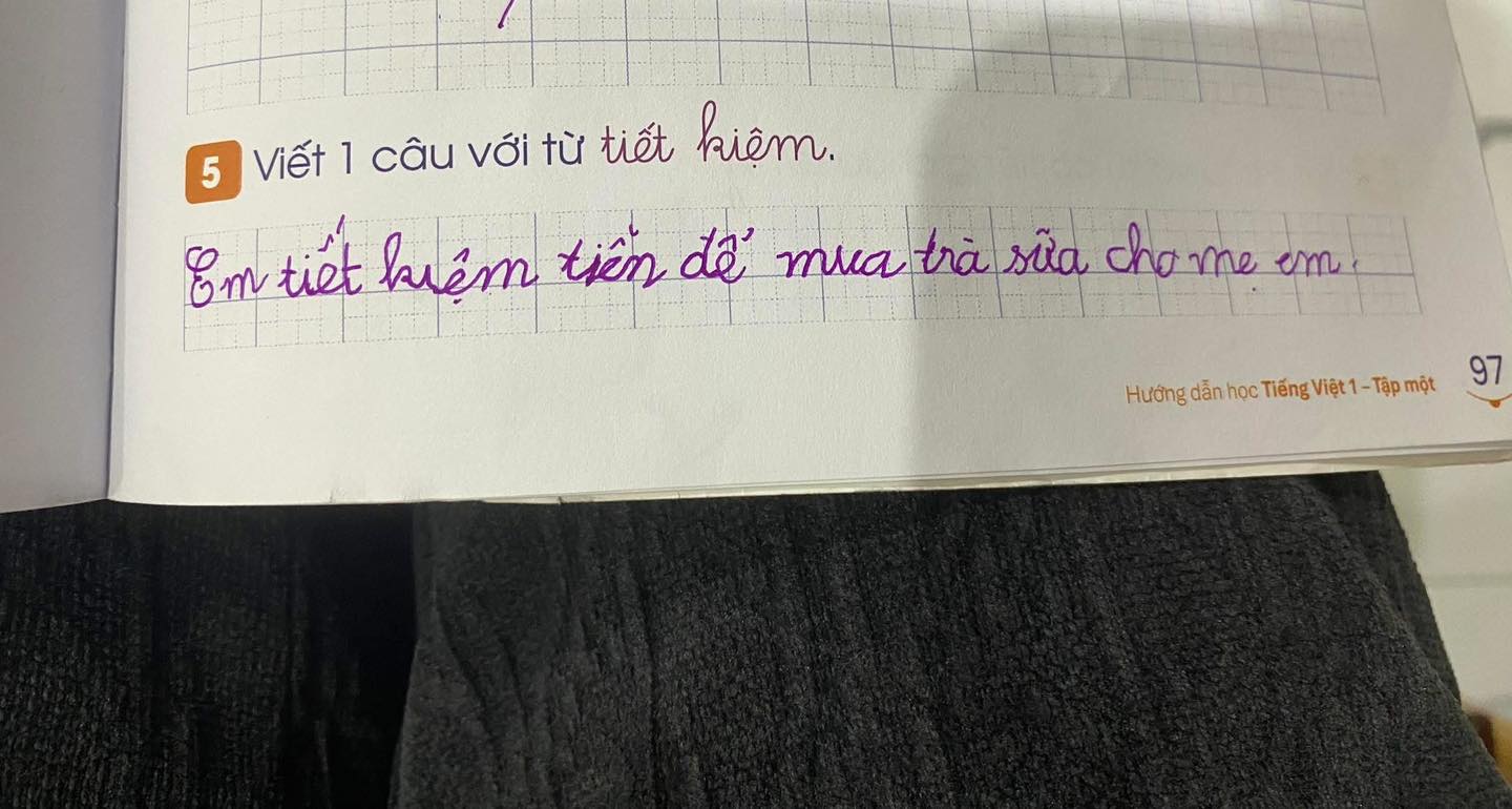 Mới đây, một bài tập tiếng Việt xuất hiện trên mạng xã hội thu hút sự chú ý. Bài tập yêu cầu “Viết 1 câu với từ tiết kiệm ” và em học sinh nắn nót viết: “Em tiết kiệm tiền để mua trà sữa cho mẹ em".