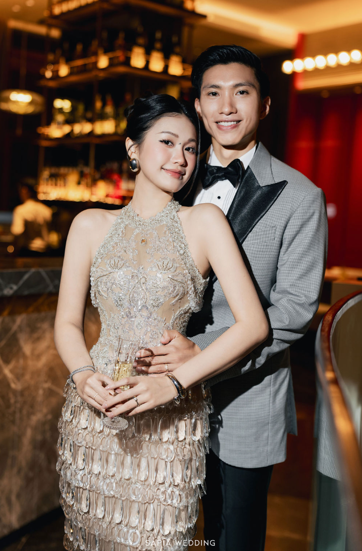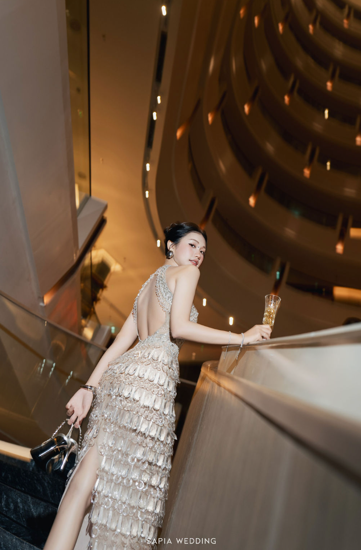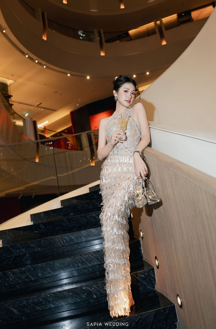 Cuối cùng, bà xã văn Hậu lựa chọn một thiết kế từ Hacchic Blush, mẫu váy đang "gây sốt" thời gian gần đây bởi vẻ lộng lẫy cùng những chi tiết đính kết cầu kỳ và độ bắt sáng tuyệt đẹp.