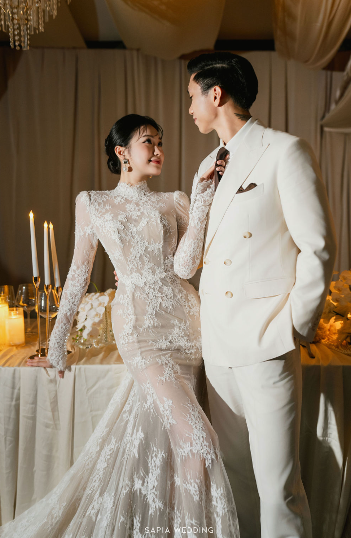 Thiết kế đầu tiên là bộ váy ren tay dài hở lưng được chế tác từ chất liệu ren nhập khẩu cao cấp. Họa tiết hoa văn tinh xảo cùng độ trong suốt nhẹ nhàng mang đến vẻ đẹp tối giản mà vẫn đầy quyến rũ, hoàn hảo cho những nàng yêu phong cách thanh lịch.
