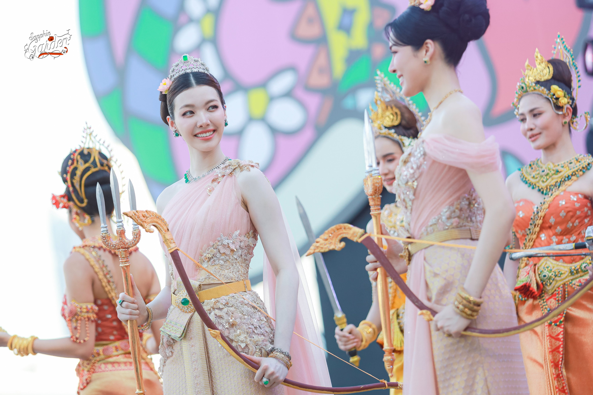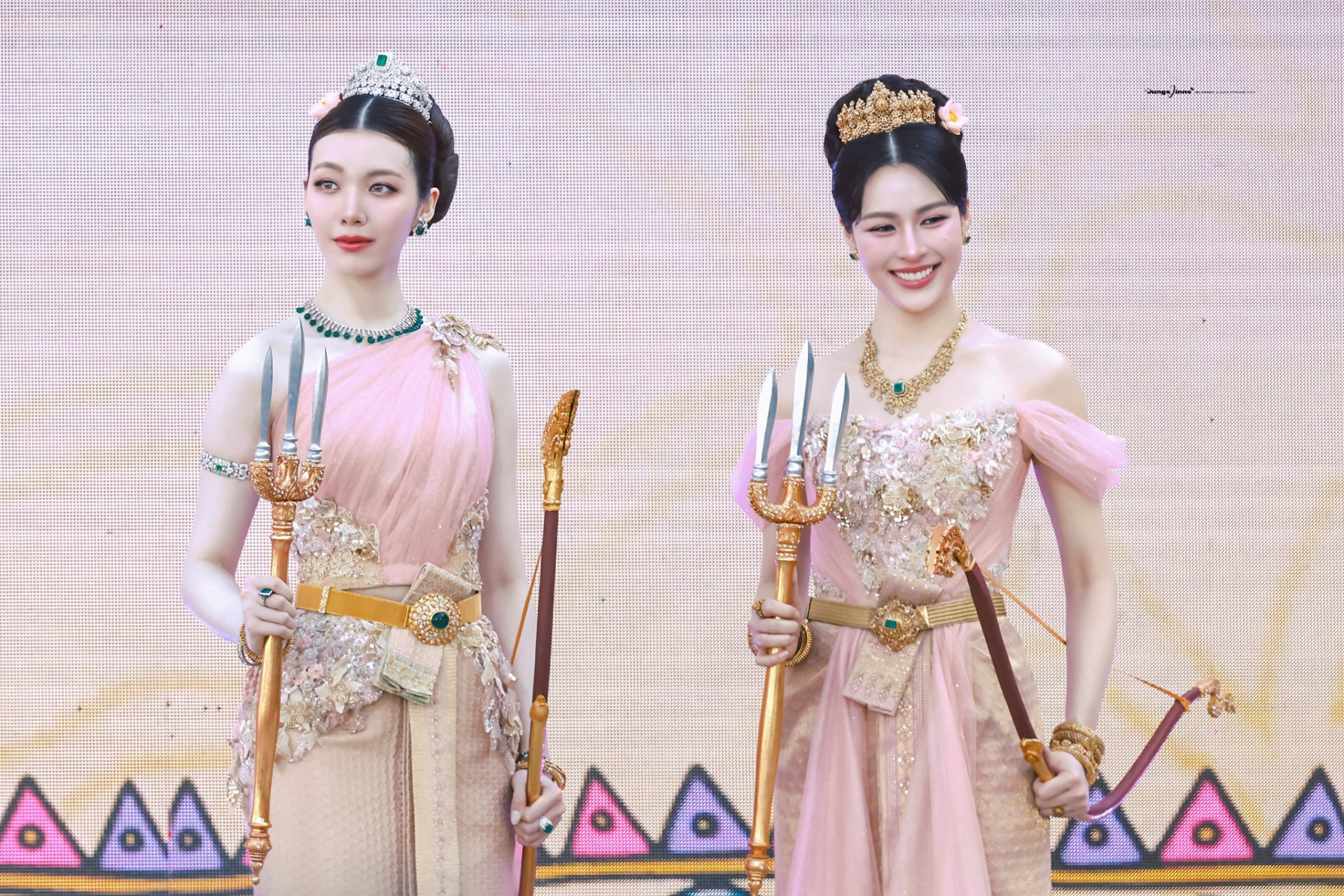 Bộ đôi nữ thần Songkran xinh đẹp, lộng lẫy như bước ra từ tranh vẽ, khiến khán giả không thể rời mắt.