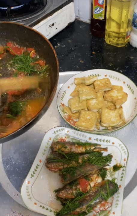 Từ những nguyên liệu quen thuộc ấy, cặp vợ chồng trẻ có thể duy trì những mâm cơm khoảng 40.000-50.000 đồng với 2-3 món như thịt ba chỉ rang cháy cạnh, cá rán sốt cà chua, đậu phụ, rau xanh hoặc canh. Không cầu kỳ, không dư dả, nhưng đủ no và phù hợp với túi tiền trong giai đoạn khó khăn.