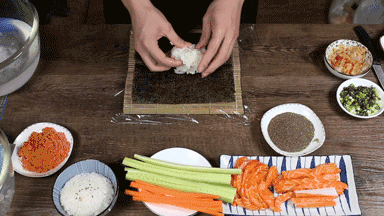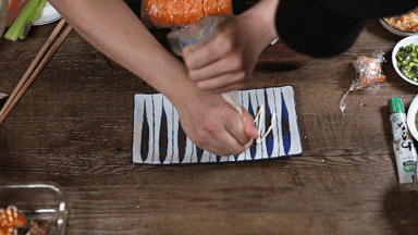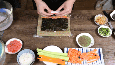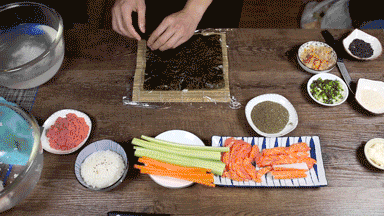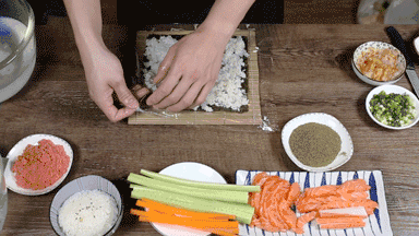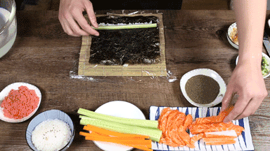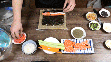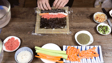 Bước 2: Cắt cá hồi tươi thành từng sợi và các lát có kích thước vừa phải. Tiếp theo, đặt một dải cơm rộng bằng khoảng nửa ngón tay vào bên trong cuộn sushi và nhẹ nhàng véo nó thành một đường mỏng song song. Làm vậy để đảm bảo sushi dính chặt vào nhau khi cuộn và không bị lỏng. Đặt miếng cá hồi thái sợi lên trên cơm và bóp nhẹ để giữ chặt, sau đó trải một dải dưa chuột cạnh dải cá hồi. Tiếp theo, thêm một thanh cà rốt và kẹp thanh cá hồi vào giữa. Cuối cùng, rắc đều một ít rong biển vụn lên các dải cà rốt.