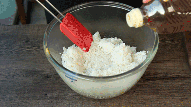 Bước 1: Thêm 4 thìa giấm sushi vào cơm, trộn đều bằng đũa hoặc thìa silicon, sau đó để nguội. Không dùng giấm sushi thay thế bằng bất kỳ loại giấm nào khác. Nếu thấy giấm mua về quá chua, bạn có thể thêm chút đường.Trải đều cơm đã nguội lên trên rong biển. Không ấn chặt cơm khi trải; thay vào đó, hãy dùng tay để làm tơi cơm. Lật ngược miếng rong biển với cơm. Tại sao lại lật ngược? Bởi vì món sushi cá hồi chúng ta làm hôm nay là một kiểu "sushi úp ngược". Sushi úp ngược nghĩa là cơm nằm ở mặt ngoài, sau đó một lớp topping được đặt lên trên.