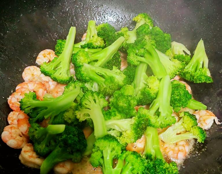 Bước 2: Đun nóng chảo rồi thêm một lượng dầu ăn vừa đủ vào nồi. Khi dầu nóng, hạ nhỏ lửa và cho tôm cùng bông cải xanh vào, xào đều. Thêm lượng muối và bột nêm vừa khẩu vị, xào nhanh cho đến khi bông cải xanh chín và tôm chuyển sang màu hồng. Sau đó tắt bếp, lấy ra đĩa là có thể thưởng thức.
