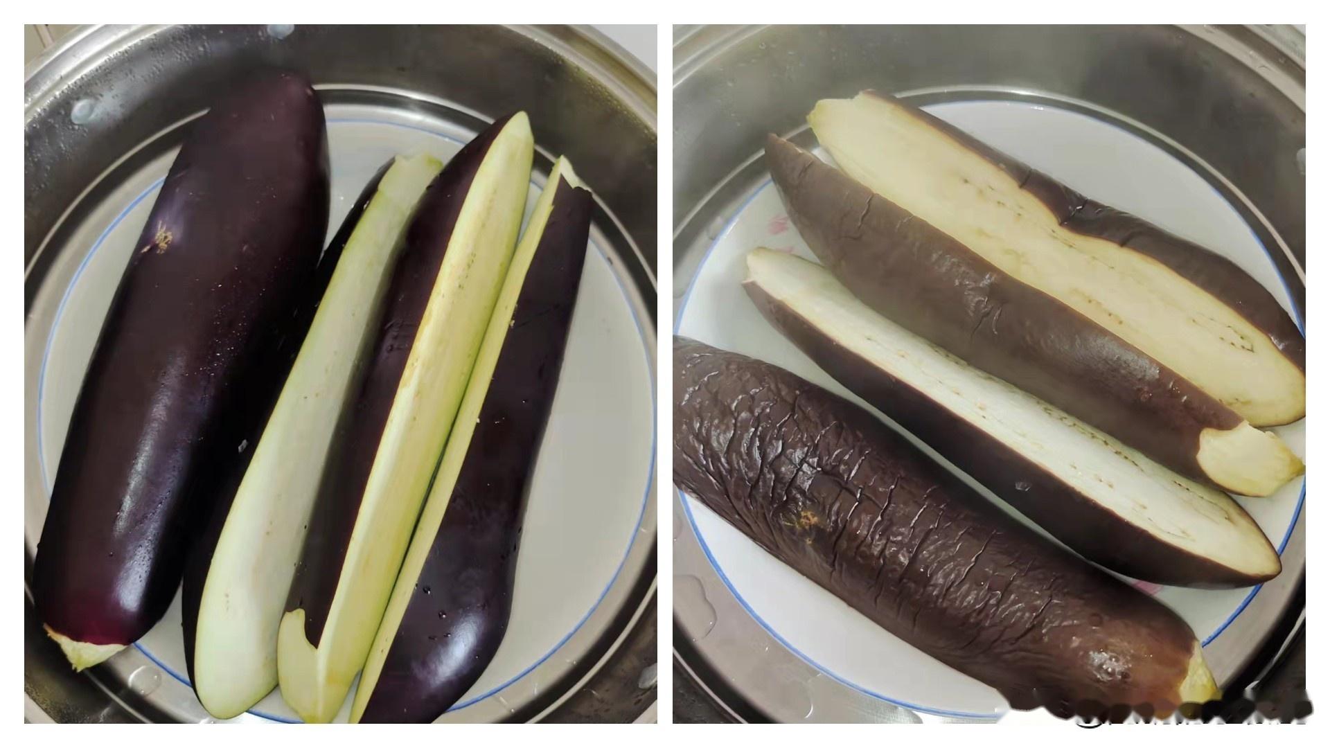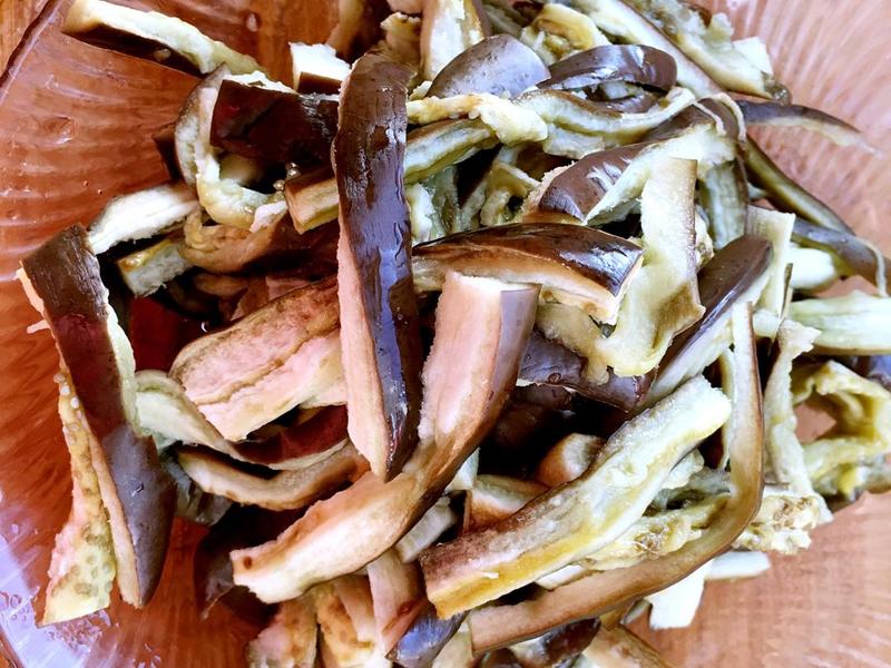 Bước 1: Rửa sạch cà tím, bỏ cuống rồi xẻ đôi và hấp trong nồi khoảng 20 phút. Sau khi cà chín, lấy ra và xé thành từng sợi dài. Hoặc bạn có thể thái cà tím thành các dải dài nhỏ rồi hấp lên, khi chín không cần phải xé nhỏ nữa. Sau khi xé cà tím xong, cho vào bát tô.