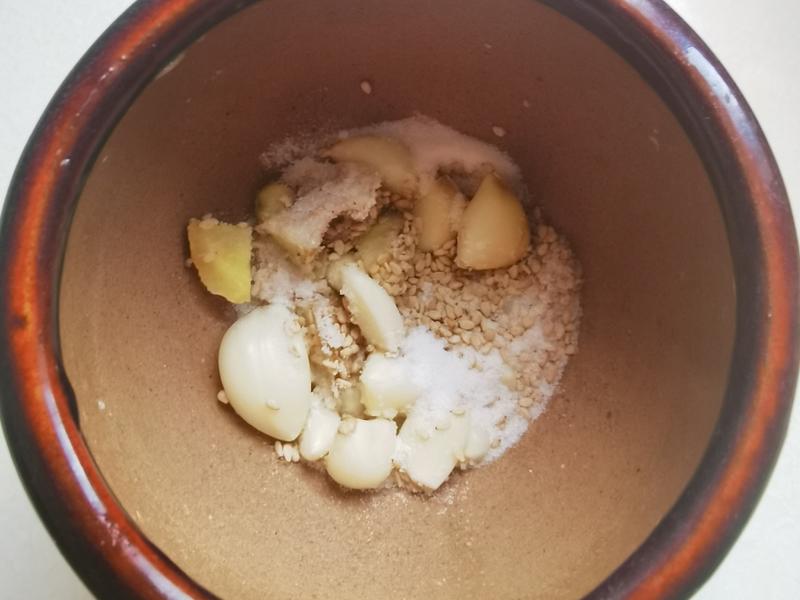 Bước 2: Trong khi hấp cà tím, bóc vỏ tỏi, rửa sạch. Cho tỏi và hạt mè rang vào cối giã, thêm một thìa muối, rồi giã nhuyễn thành hỗn hợp tỏi băm. Nếu thích ăn cay, bạn có thể băm một quả ớt nhỏ. Sau đó cho hỗn hợp tỏi vào bát đựng cà tím, thêm dầu mè vừa đủ, trộn đều và ướp trong 30 phút trước khi ăn.