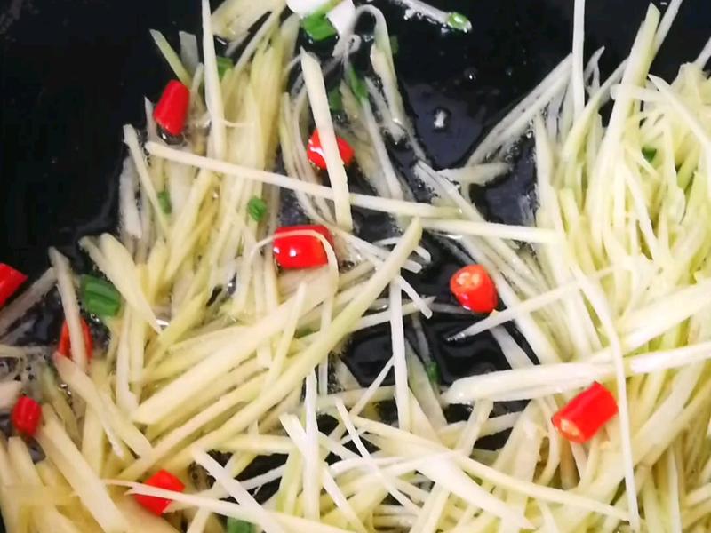 Bước 2: Cho một ít dầu ăn vào chảo, đun nóng rồi thêm phần gốc hành lá, ớt vào xào thơm. Tiếp theo cho gừng thái sợi vào xào đều một lúc. Sau đó cho thịt heo thái sợi vào xào đến khi chín. Sau đó nêm thêm muối và bột ngọt cho vừa ăn. Xào đến khi các nguyên liệu ngấm hương vị của nhau vừa khẩu vị thì tắt bếp dọn ra đĩa.