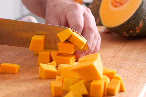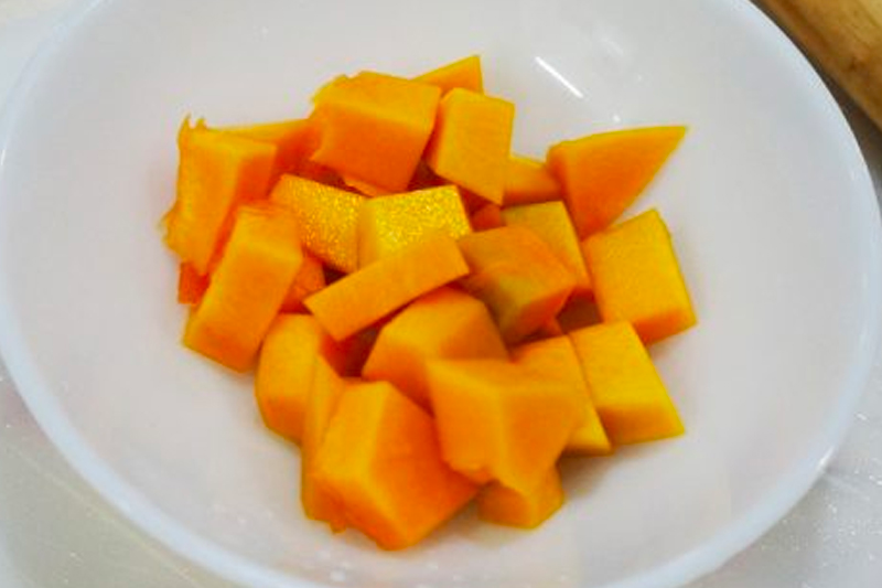 Bước 1: Loại bỏ lớp vỏ bên ngoài và phần ruột bên trong của bí đỏ, rửa sạch và cắt thành từng miếng nhỏ để sử dụng sau.