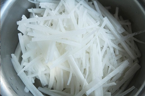 Bước 6: Cuối cùng cho củ cải thái sợi vào nấu đến khi chín, thêm chút muối vừa ăn là món canh đã sẵn sàng, rắc chút hành lá hoặc rau mùi thái nhỏ vào rồi thưởng thức.