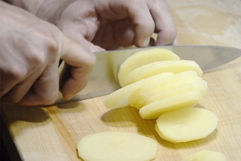 Bước 1: Rửa sạch một miếng thịt ba chỉ nhỏ và cắt thành lát mỏng. Gọt vỏ, rửa sạch và cắt lát khoai tây.