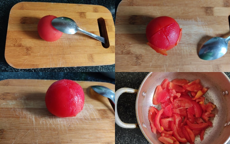 Bước 1: Rửa sạch cà chua và khía hình chữ thập lên đầu quả, chần qua nước sôi để bóc vỏ. Sau đó cắt cà chua thành từng miếng. Gọt vỏ củ mài và cắt thành từng khúc vừa ăn (nhớ đeo găng tay, nếu không tay bạn sẽ bị ngứa). Đun nóng một ít dầu ăn trong nồi, sau đó cho cà chua vào xào đến khi mềm nhuyễn.