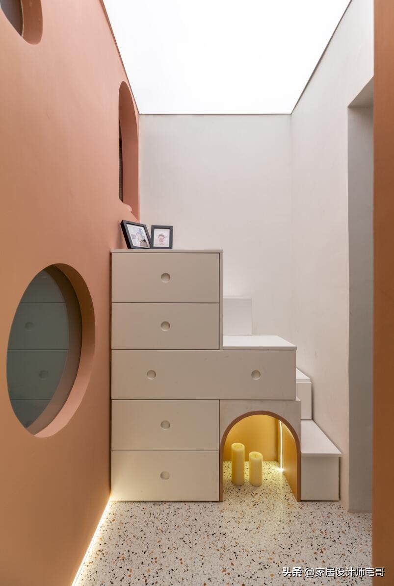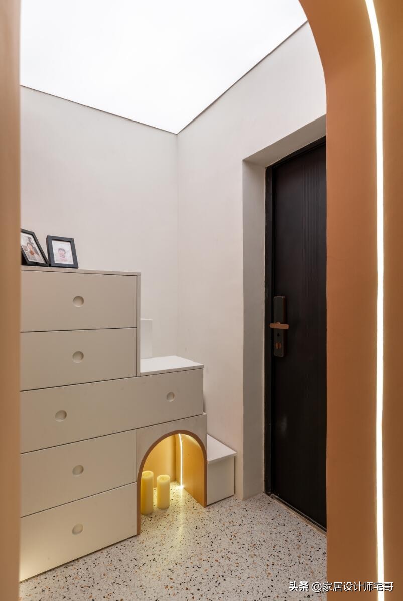 Ngay khu vực lối vào, tủ giày được thiết kế kết hợp bậc thang dẫn lên phòng ngủ trẻ em, vừa tiết kiệm diện tích vừa tăng khả năng lưu trữ.