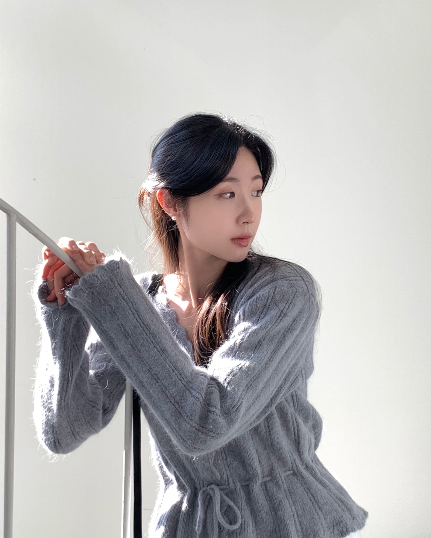 Bạn chỉ cần lấy nửa phần tóc phía trên, buộc gọn ra sau bằng dây thun nhỏ hoặc kẹp xinh xắn. Có thể uốn nhẹ phần đuôi tóc để tạo độ bồng bềnh, giúp mái tóc trông dày và mềm mại hơn. Nếu muốn tăng thêm điểm nhấn, hãy để vài lọn tóc mai buông lơi quanh mặt, chi tiết nhỏ này sẽ giúp gương mặt trông hài hòa và "có hồn" hơn khi mặc áo len trơn màu.