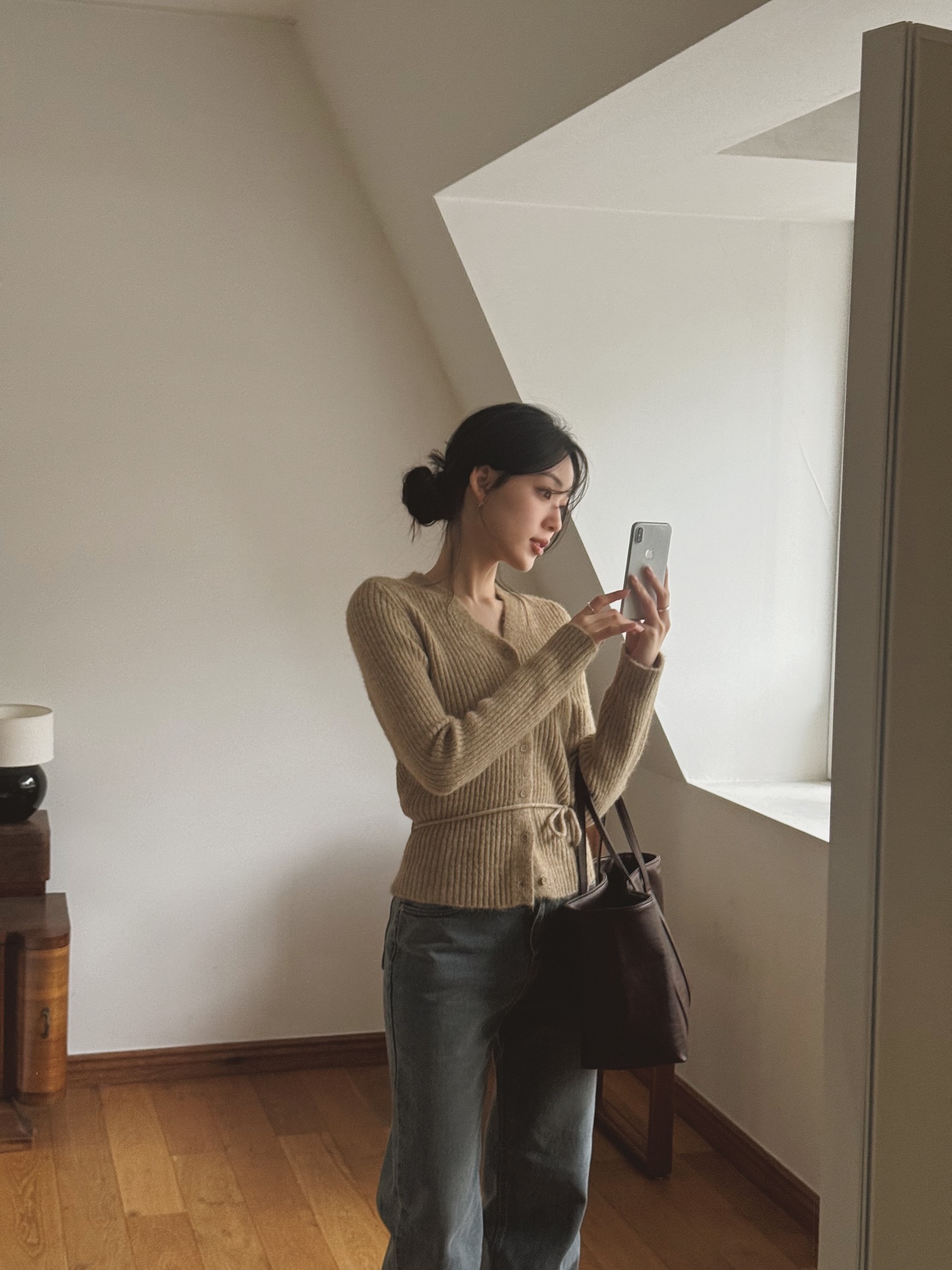 Búi cao mang lại cảm giác trẻ trung, cá tính, phù hợp với áo len dáng ngắn hoặc áo len form rộng kết hợp quần cạp cao. Trong khi đó, búi thấp lại tạo vẻ chín chắn, dịu dàng, rất hợp với áo len dáng dài, váy len hoặc chân váy midi. Đừng quên kéo nhẹ vài lọn tóc nhỏ quanh trán hoặc sau gáy để kiểu búi không bị quá "đứng tuổi".