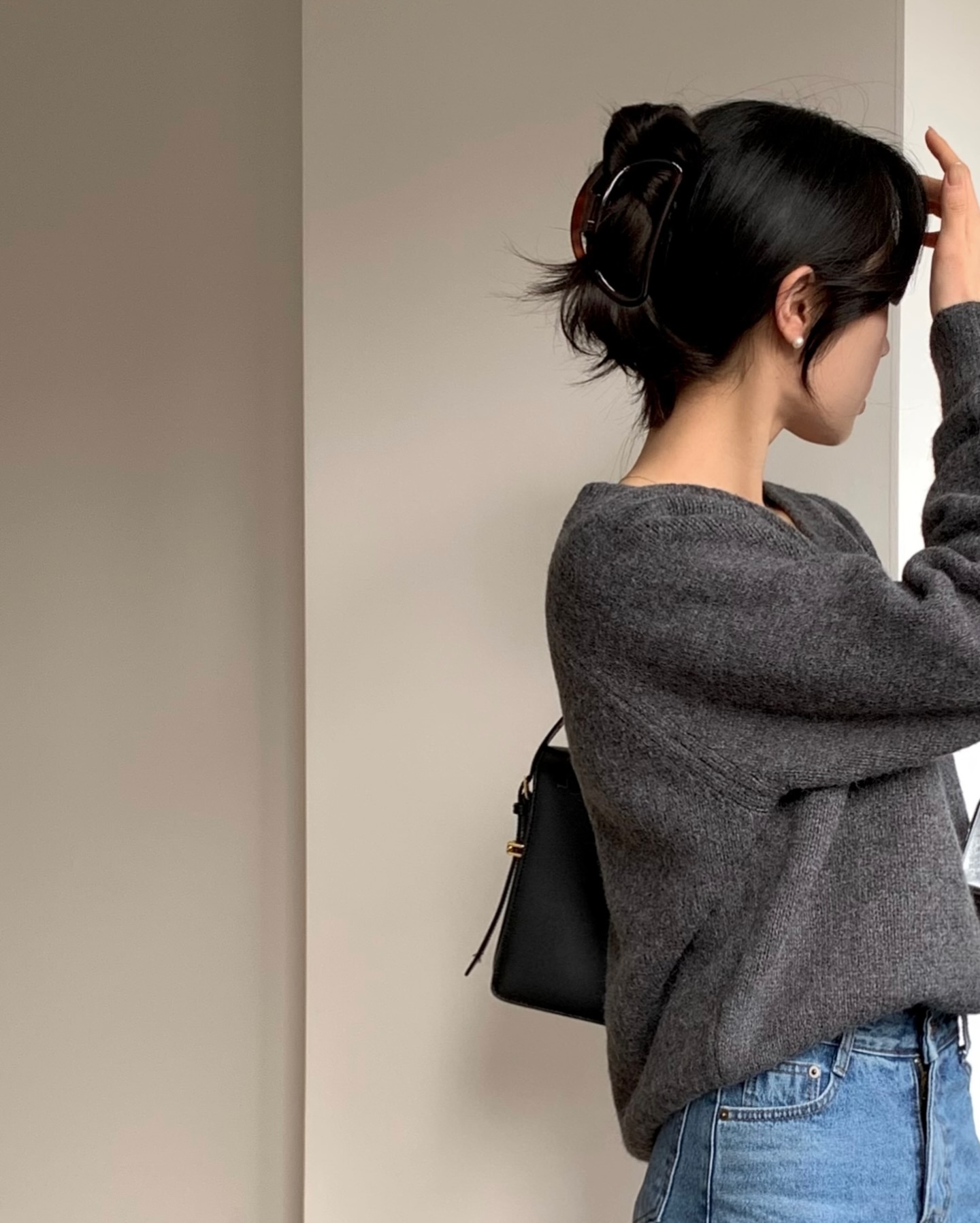 Bạn chỉ cần xoắn gọn tóc lên và cố định bằng kẹp càng cua phía sau đầu. Có thể để vài lọn tóc rơi tự nhiên ở hai bên tai hoặc sau gáy để tổng thể trông mềm mại hơn. Kiểu tóc này đặc biệt hợp khi mặc áo len oversize, áo len cổ rộng hoặc cardigan, tạo cảm giác như vừa thoải mái vừa có gu.