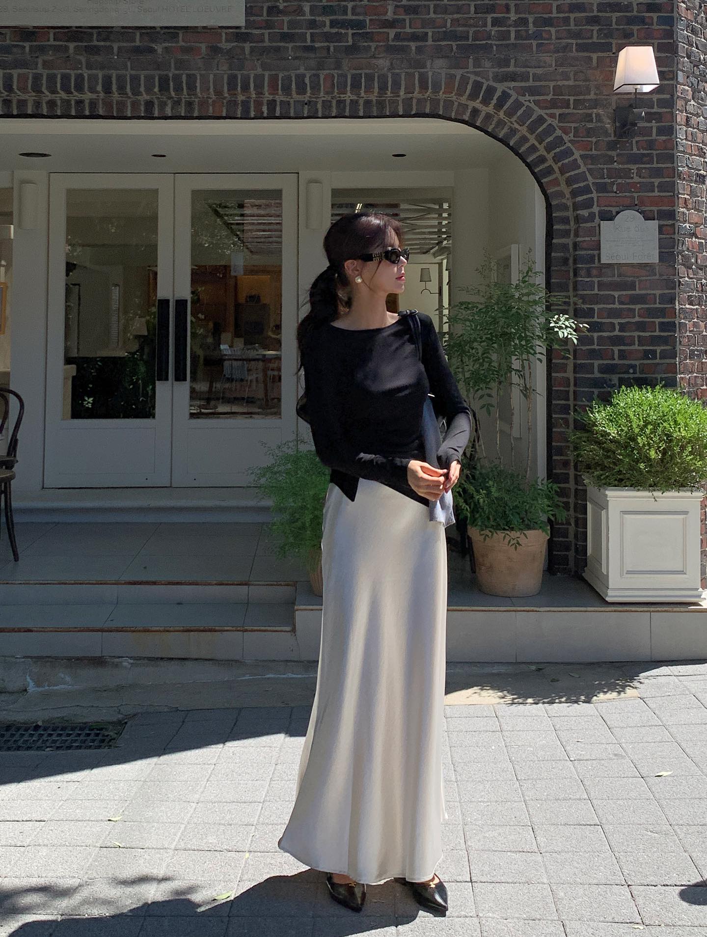 Nếu bạn yêu thích phong cách nữ tính, hãy thử kết hợp áo thun dài tay với chân váy. Đây là công thức phối đồ vừa dễ áp dụng, vừa tạo cảm giác mềm mại, duyên dáng nhưng không kém phần chuyên nghiệp.