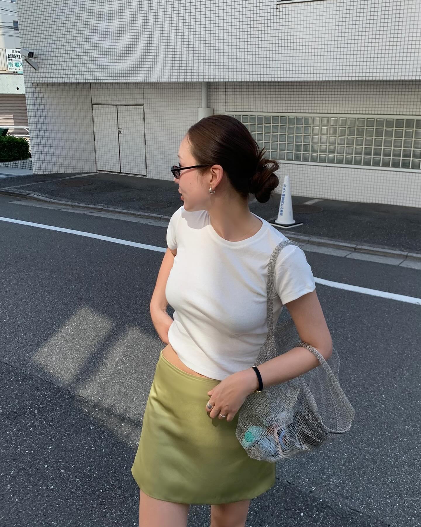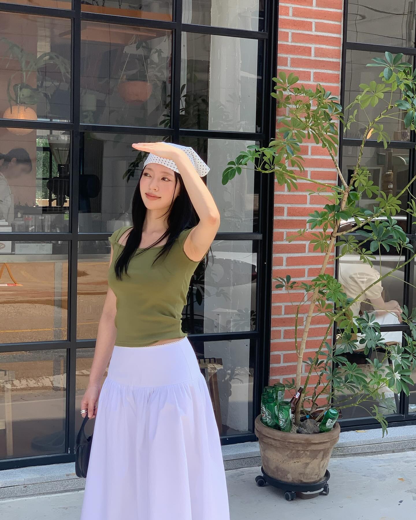 Sự kết hợp giữa áo thun và chân váy mang đến vẻ ngoài nữ tính mà vẫn giữ được sự năng động. Đây là công thức phối đồ phù hợp với nhiều hoàn cảnh, từ đi làm đến dạo phố hay cà phê cuối tuần. Nếu bạn yêu thích phong cách nhẹ nhàng, hãy chọn áo thun trơn kết hợp cùng chân váy midi dáng xòe hoặc chân váy lụa. Bộ đôi này giúp tạo cảm giác mềm mại, bay bổng mà không quá cầu kỳ.