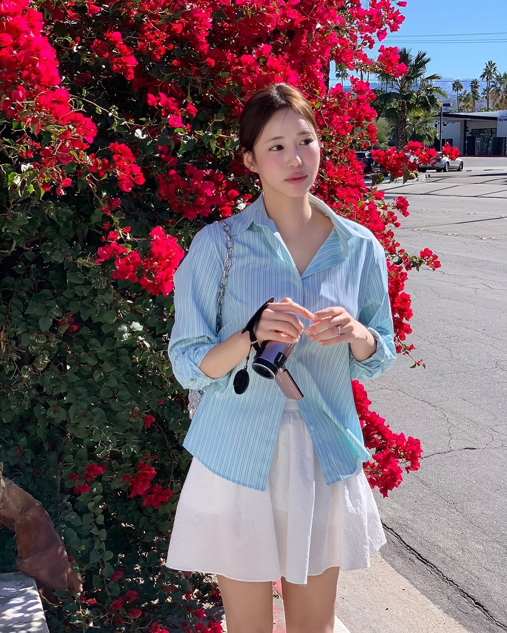 Bạn có thể thử buộc vạt áo hoặc mở vài cúc trên để tạo sự thoải mái, phóng khoáng. Nếu muốn tăng điểm nhấn, hãy chọn sơ mi có họa tiết kẻ sọc hoặc màu sắc nổi bật, phối cùng chân váy trung tính. Giày sneaker trắng hoặc sandal đế bệt là lựa chọn phù hợp để giữ sự tiện lợi khi di chuyển nhiều.