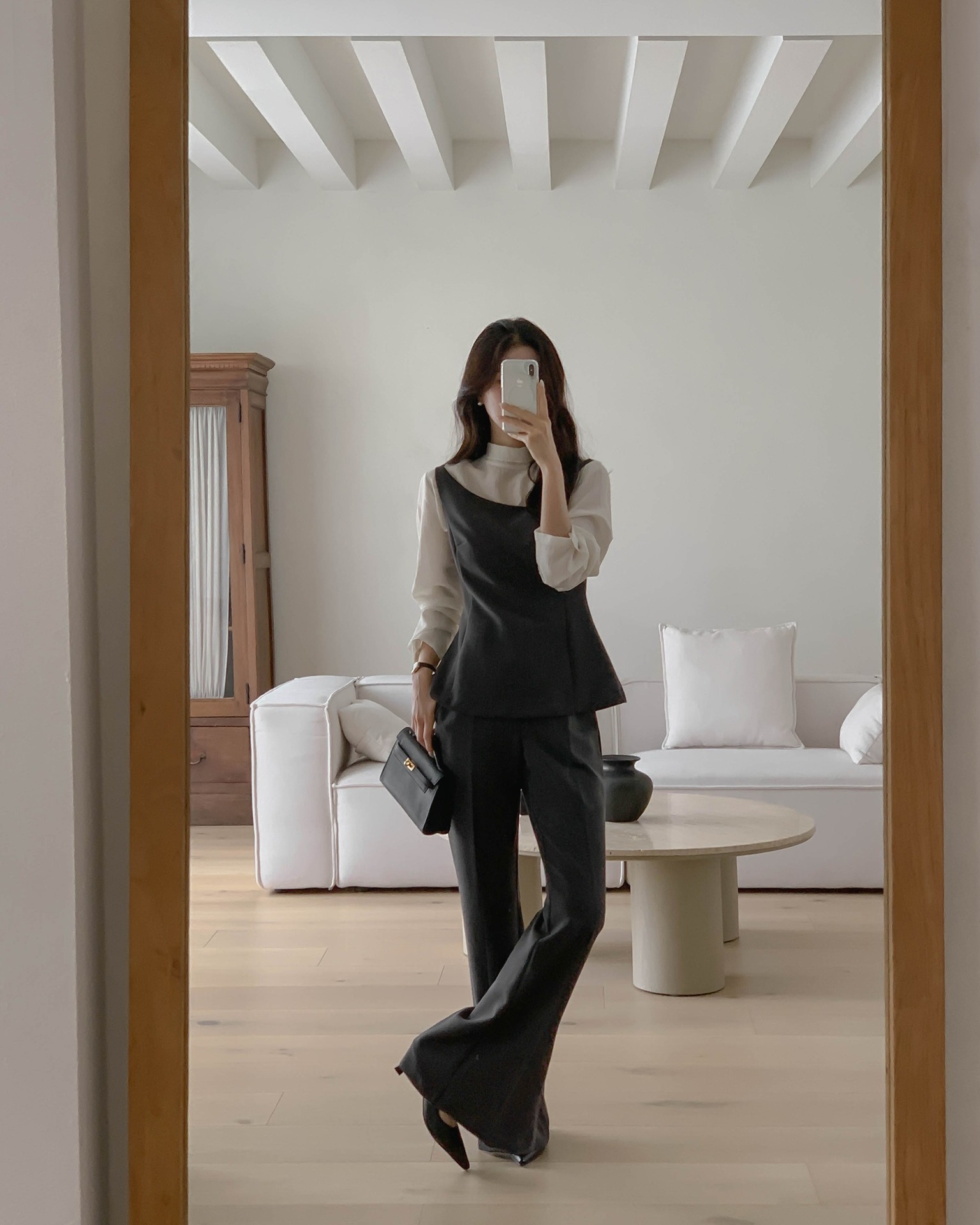 Khi phối quần có đường ly giữa cùng áo cổ lọ ôm sát hoặc cardigan dáng ngắn, tổng thể trông cân đối, hiện đại và thanh lịch. Với những ngày lạnh sâu, khoác thêm trench coat hoặc áo dạ dáng dài sẽ vừa ấm vừa tôn dáng vì đường ly của quần sẽ tạo chiều dài liên tục từ eo xuống chân.