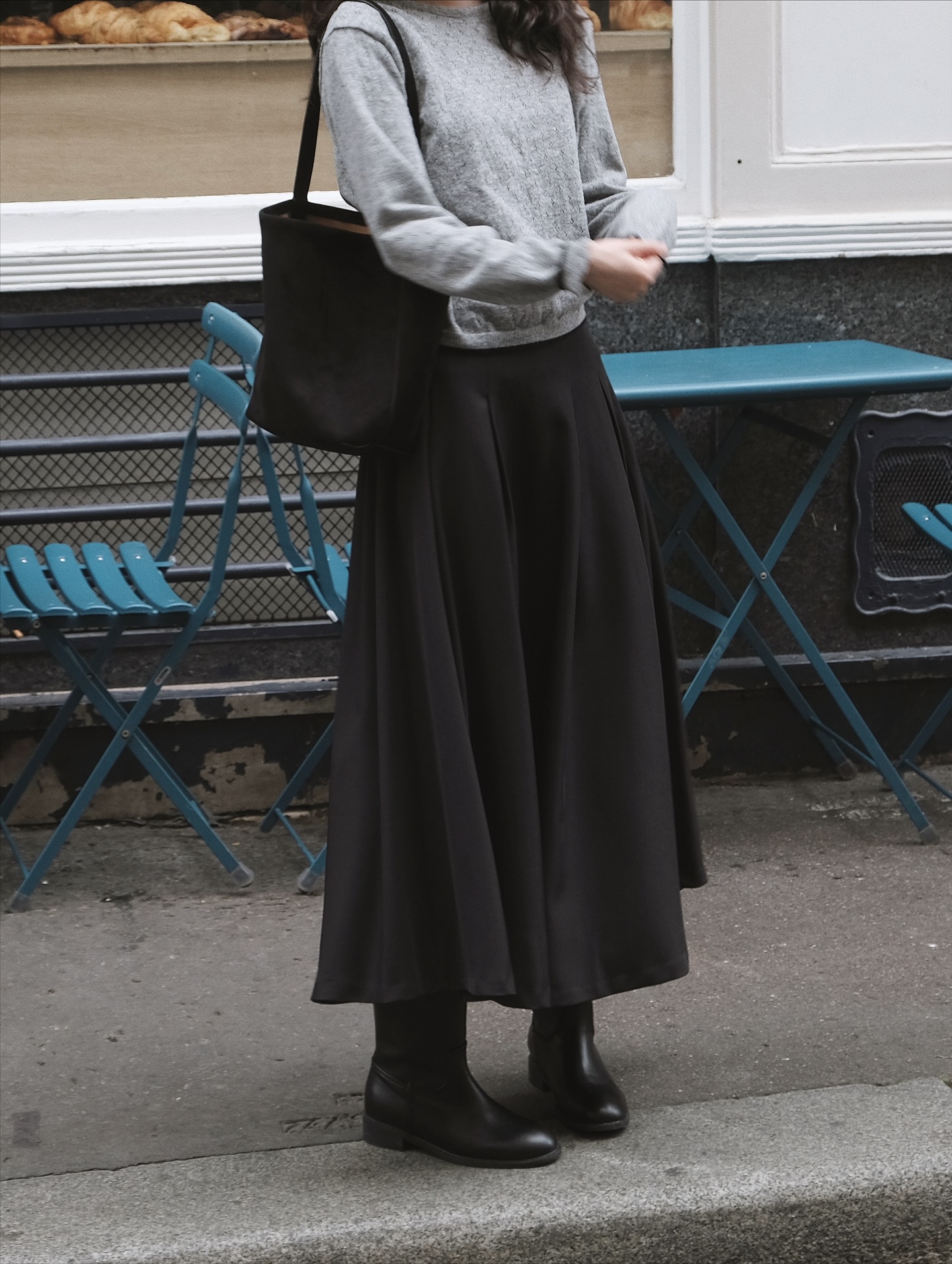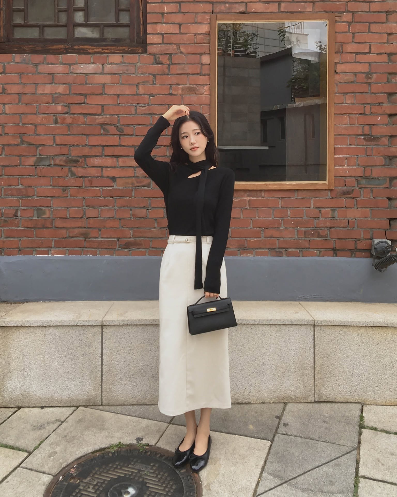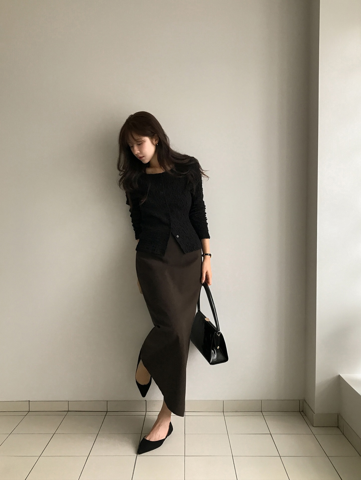 Một mẹo nhỏ là bạn nên chọn chân váy suông có chiều dài chạm gối hoặc qua gối một chút để giữ nét trang trọng. Khi phối cùng giày mũi nhọn màu be, đôi chân sẽ trông dài và thanh mảnh hơn đáng kể.