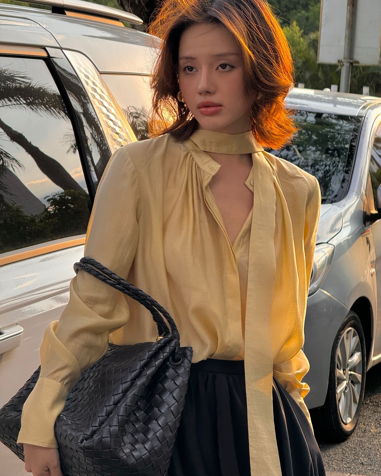 Fashionista Khánh Linh chính là hình mẫu hoàn hảo cho kiểu tóc này. Cô lựa chọn phong cách tóc ngắn xoăn nhẹ với màu nâu hạt dẻ, đây là tông màu vừa tôn da vừa tăng thêm độ sang chảnh cho tổng thể diện mạo. Nhờ cách tạo kiểu khéo léo, Khánh Linh trông không chỉ thời thượng mà còn mang vẻ đẹp quý phái, cuốn hút.