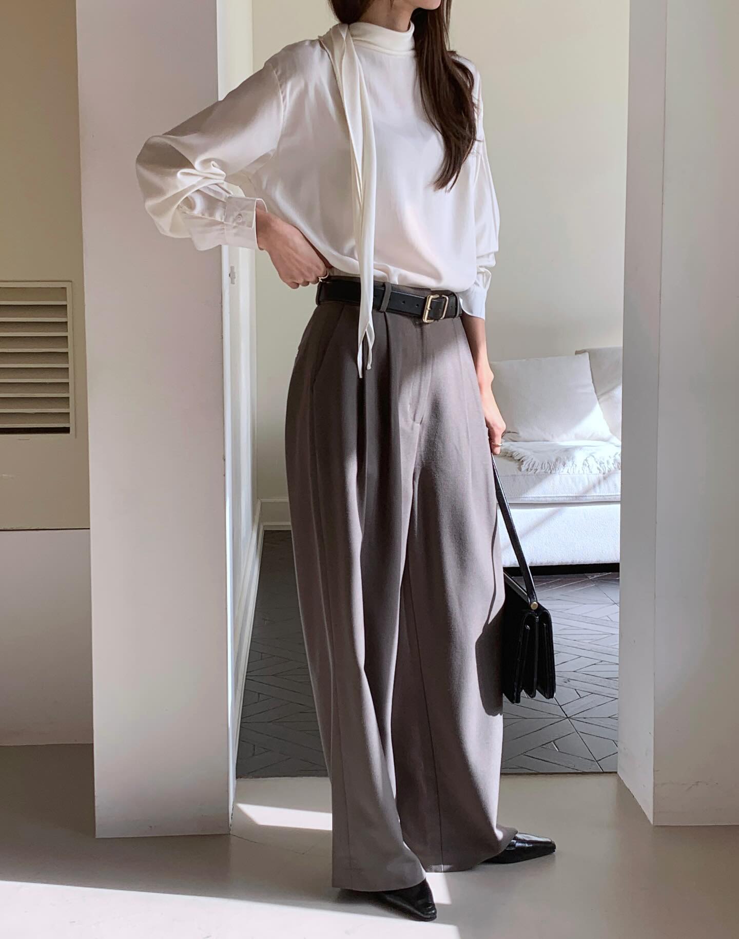 Điểm quan trọng của công thức này nằm ở sự vừa vặn. Một chiếc áo quá rộng hay quần quá dài đều có thể làm mất đi tinh thần tối giản. Vì vậy, hãy chú ý đến đường may, độ dài ống quần và cách phối màu đồng điệu. Chỉ cần thêm một đôi giày loafers hoặc cao gót mũi nhọn, bạn đã có ngay set đồ công sở chuẩn chỉnh cho cả ngày làm việc.