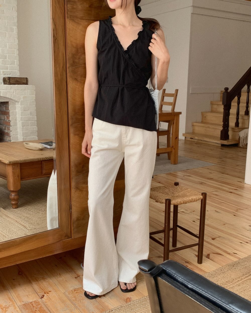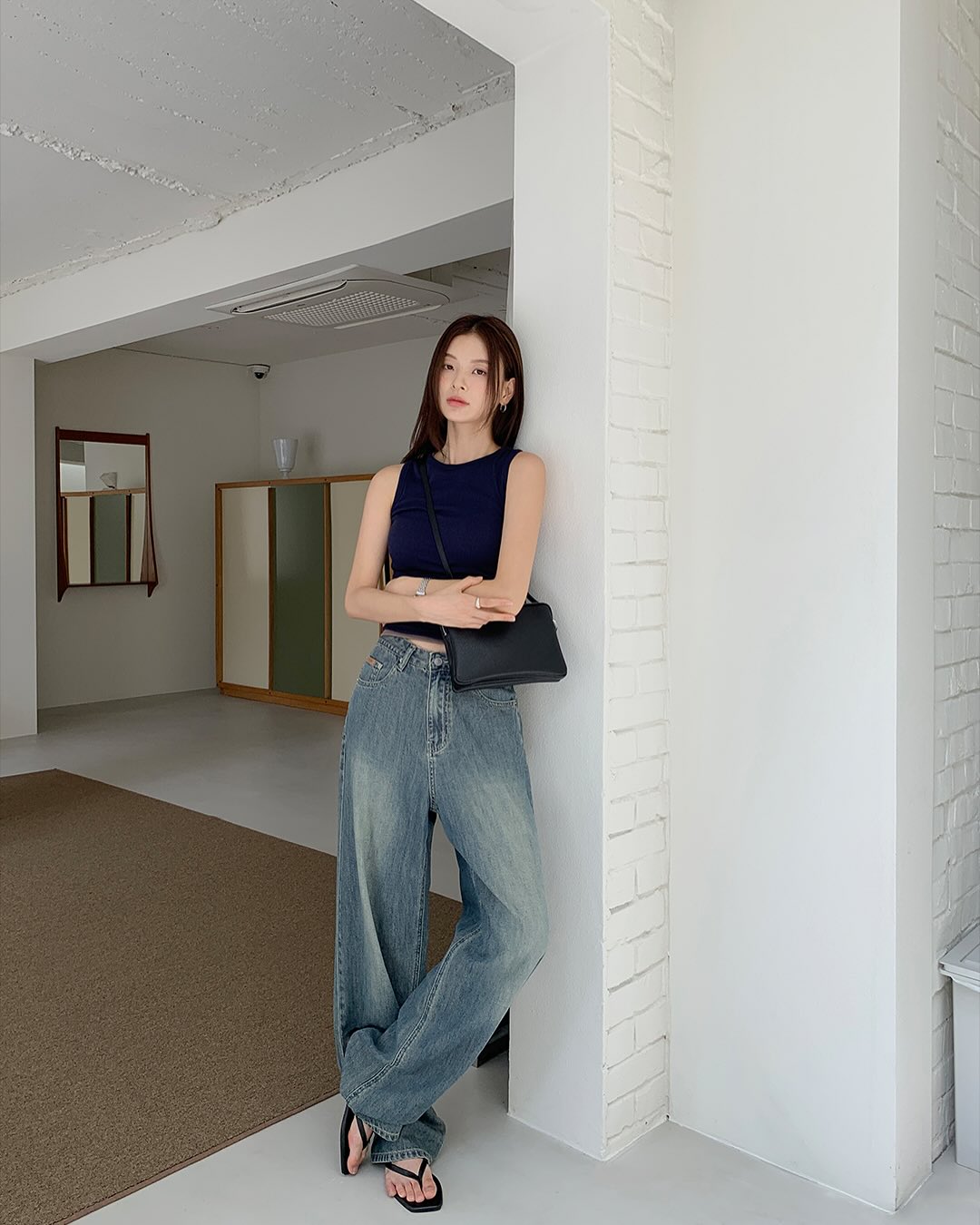 Áo tank top là lựa chọn hoàn hảo cho những ngày nhiệt độ tăng cao. Thiết kế không tay, ôm nhẹ giúp phần thân trên trông gọn gàng hơn, từ đó tạo sự cân bằng với quần ống rộng bên dưới.