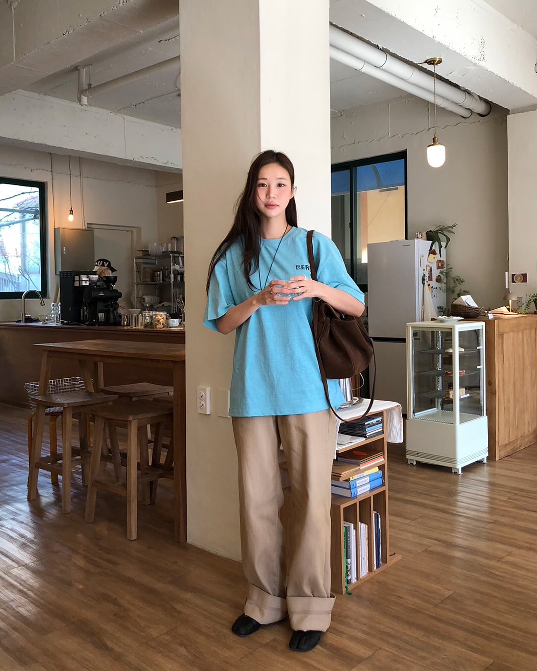 Không cần quá cầu kỳ, áo thun luôn là lựa chọn an toàn nhưng hiệu quả khi đi cùng quần ống rộng. Sự tối giản của áo thun giúp cân bằng lại phom dáng rộng rãi của quần, mang đến vẻ ngoài năng động và dễ tiếp cận.