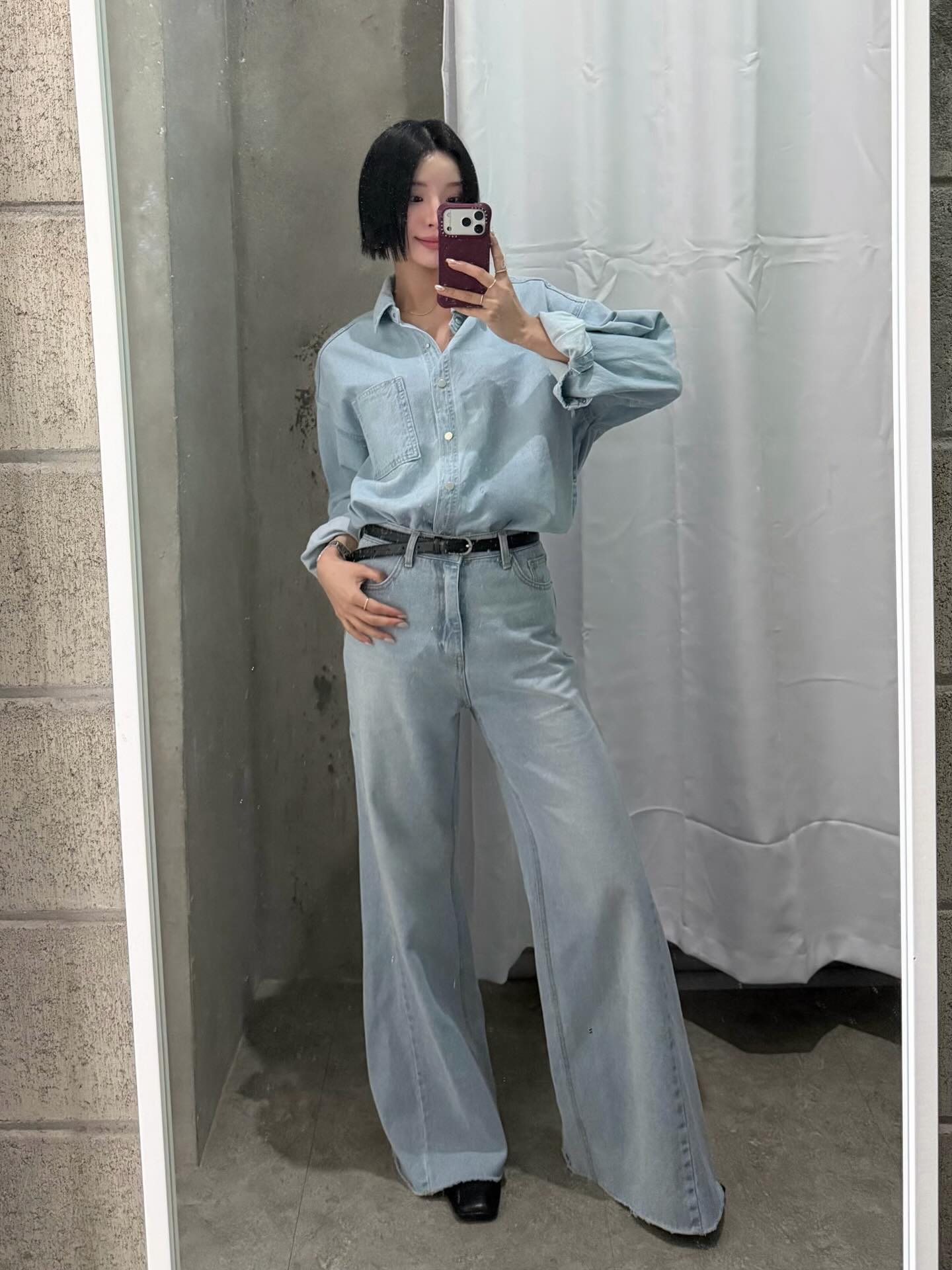 Một chiếc sơ mi denim xanh nhạt sẽ mang lại cảm giác mềm mại và dễ phối hơn so với denim đậm màu. Bạn có thể kết hợp với quần trắng, chân váy ngắn hoặc thậm chí là mặc theo set denim-on-denim nếu biết cách cân bằng màu sắc. Để tổng thể không bị nặng nề, hãy ưu tiên các thiết kế mỏng nhẹ, form rộng vừa phải.
