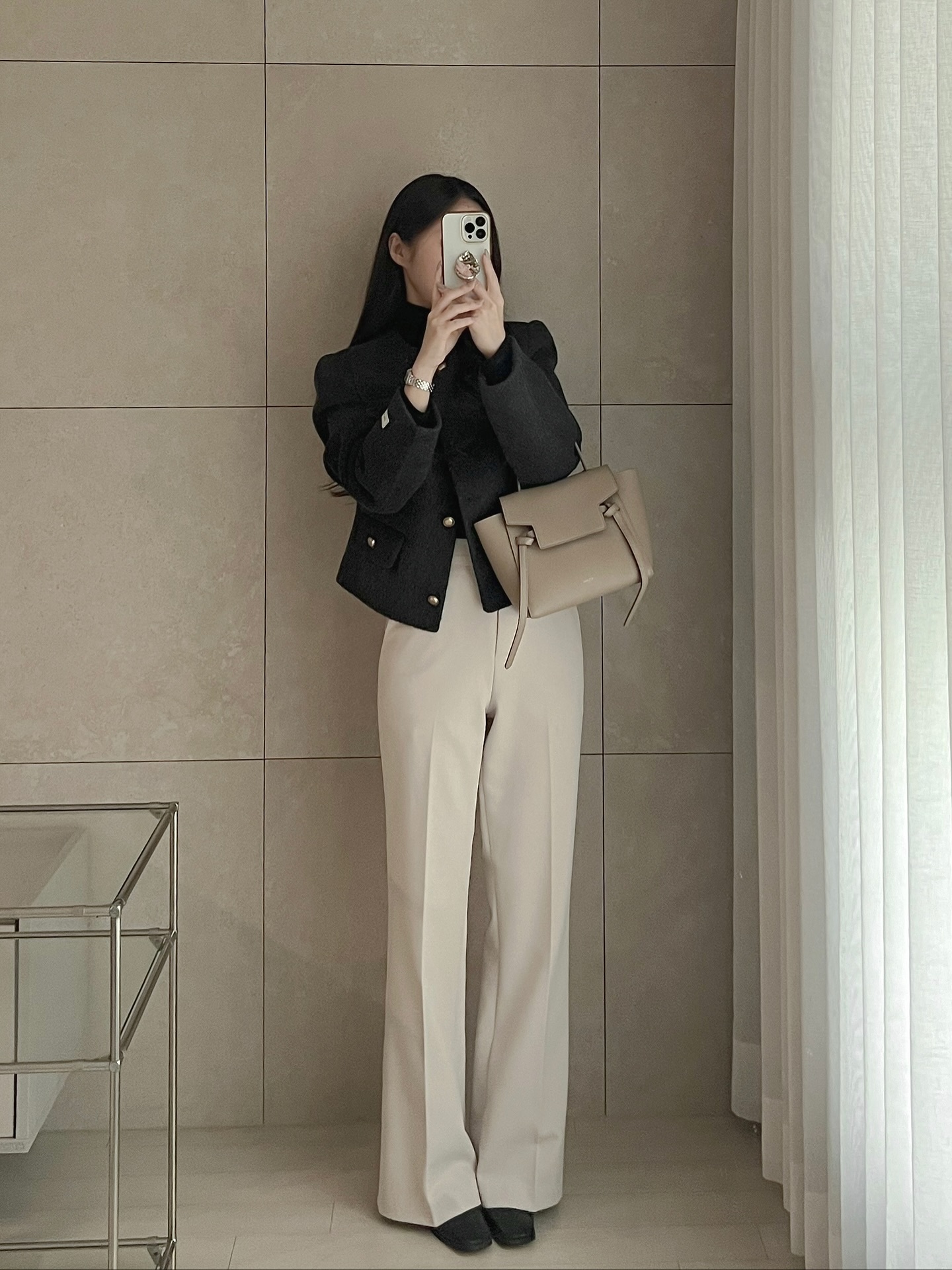 Quần ống loe đặc biệt phù hợp với những ai có bắp chân to hoặc chiều cao khiêm tốn. Khi kết hợp cùng giày cao gót hoặc giày đế xuồng, hiệu ứng "chân dài miên man" sẽ được phát huy tối đa. Ngoài ra, quần ống loe cạp cao còn giúp vòng eo trông thon gọn hơn, mang lại vẻ ngoài nữ tính và có chút hoài cổ. Chỉ cần một chiếc áo ôm vừa vặn hoặc áo croptop đơn giản, tổng thể đã đủ nổi bật mà không cần quá nhiều phụ kiện cầu kỳ.