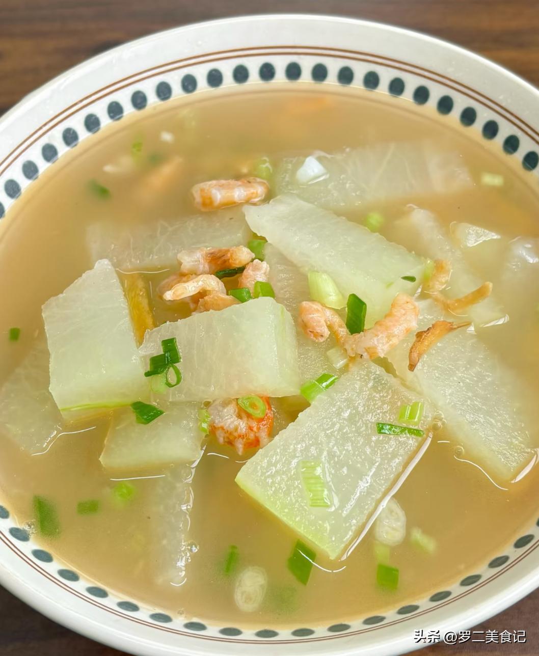 Bước 1: Gọt vỏ và bỏ hạt bí đao, rửa sạch và thái lát mỏng rồi để riêng. Rửa sơ tôm khô để loại bỏ bụi bẩn. Cho lượng nước vừa đủ vào nồi, thêm tôm khô và đun sôi trên lửa vừa trong 2 phút, để tạo thành nước dùng thơm ngon.