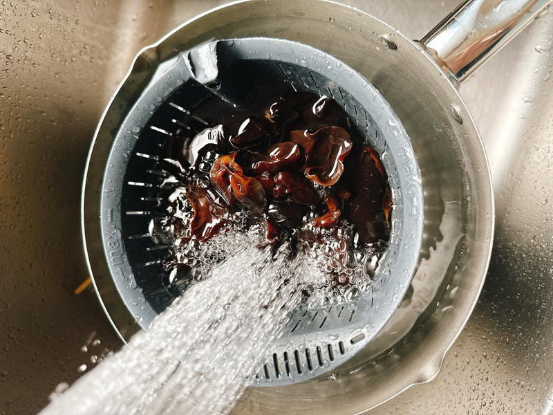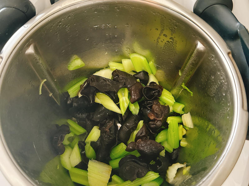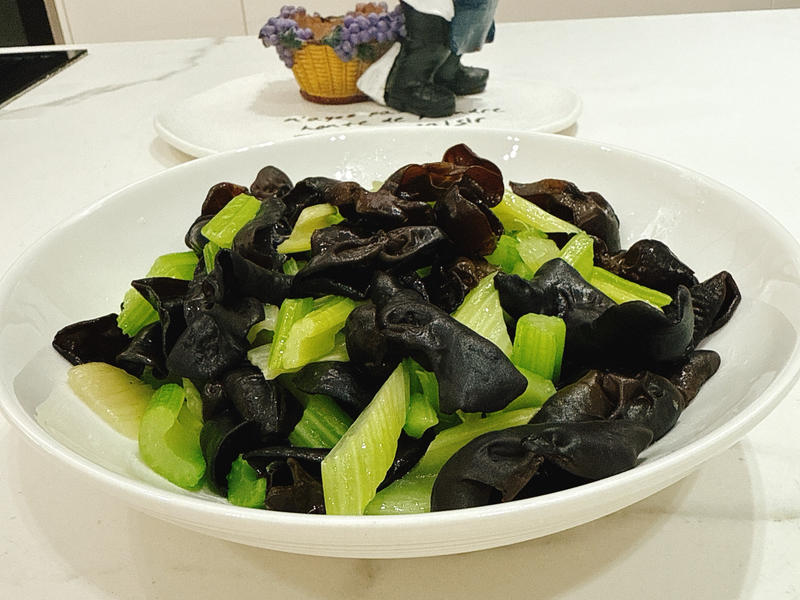 Bước 1: Ngâm mộc nhĩ khô trong nước ấm khoảng nửa tiếng trước khi chế biến, cắt bỏ phần rễ lẫn tạp chất. Sau đó rửa sạch, chần qua nước sôi trong 1 phút, vớt ra và để ráo nước để khử mùi tanh của mộc nhĩ. Loại bỏ lá già và xơ cứng khỏi cần tây, cắt chéo thành những khúc nhỏ đều nhau, rồi rửa sạch với nước; bóc vỏ và băm nhỏ tỏi, đun nóng chảo với một ít dầu ăn, rồi phi thơm tỏi băm.