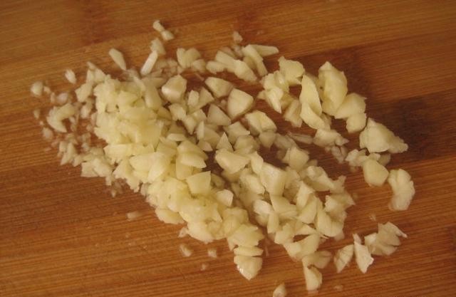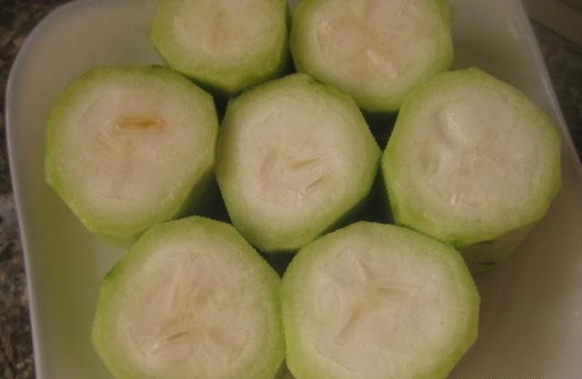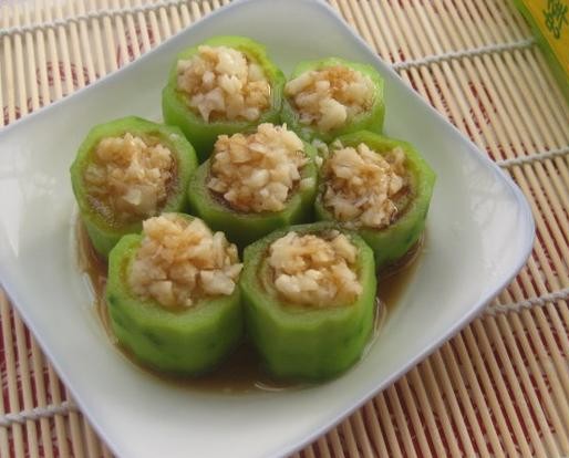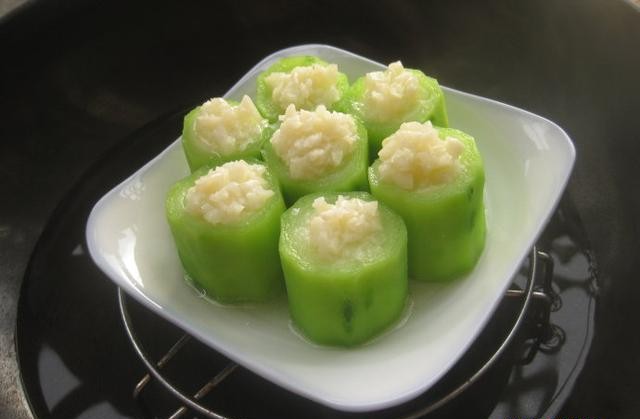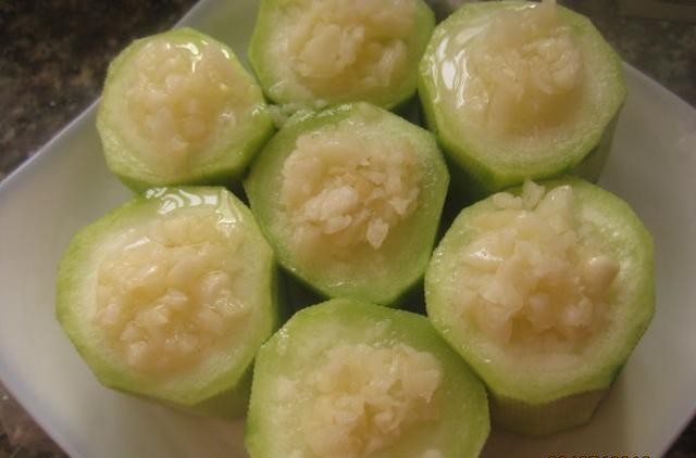 Bước 1: Gọt bỏ lớp vỏ cứng bên ngoài của mướp hương sau đó rửa sạch và cắt thành các khúc đều nhau. Xếp chúng gọn gàng lên đĩa, không chồng lên nhau để chúng chín đều. Bóc vỏ tỏi sau đó đập dập và băm nhỏ. Sau đó rải đều tỏi băm lên bề mặt mướp. Đun sôi nước trong nồi hấp trước, đặt đĩa mướp lên xửng và hấp ở lửa lớn trong 8 phút.