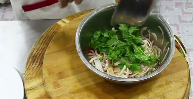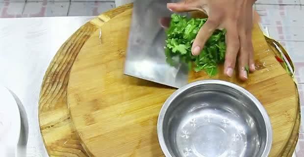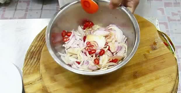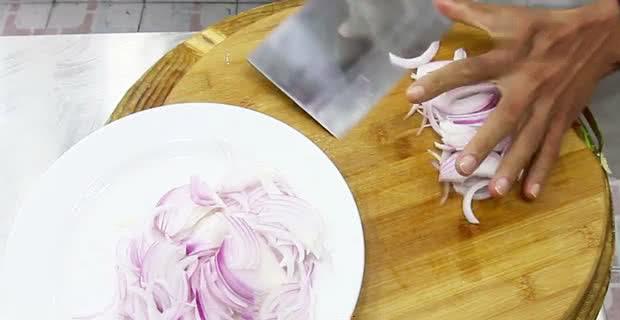 Bước 1: Bóc vỏ ngoài của hành tây, bổ đôi rồi thái mỏng. Ngâm hành tây trong nước sôi để nguội khoảng 10 phút để khử mùi hăng và làm giảm độ cay. Rửa sạch rau mùi và cắt nhỏ. Cắt ớt thành khoanh. Cho tất cả vào một bát sạch và để sang một bên.