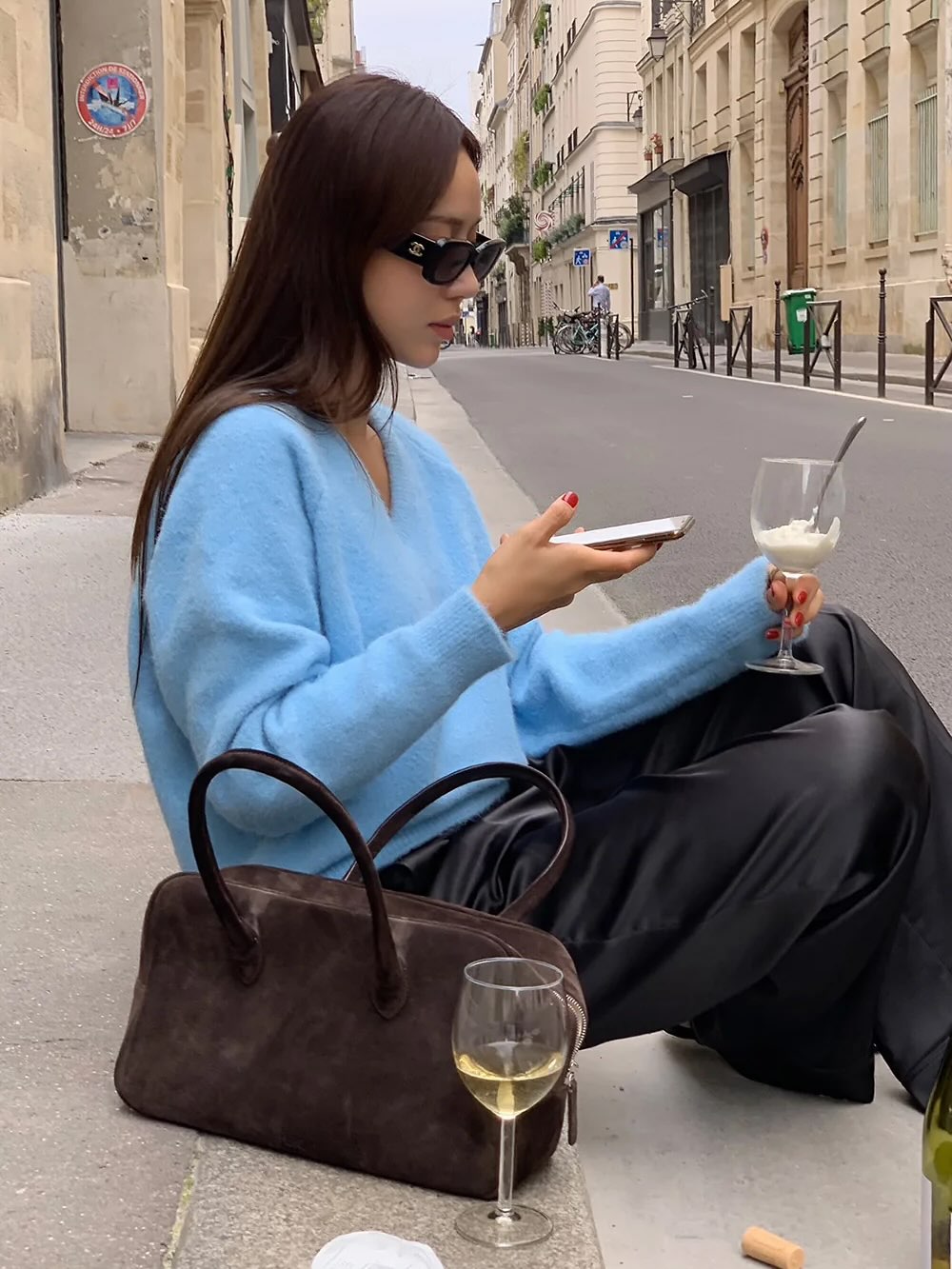 Quan trọng là bạn nên kết hợp màu đậm với các item trung tính để không bị "dừ". Ví dụ: áo len đỏ đậm + chân váy đen, áo len xanh navy + quần be. Sự tương phản này giúp outfit trông cân đối và tươi tắn hơn.