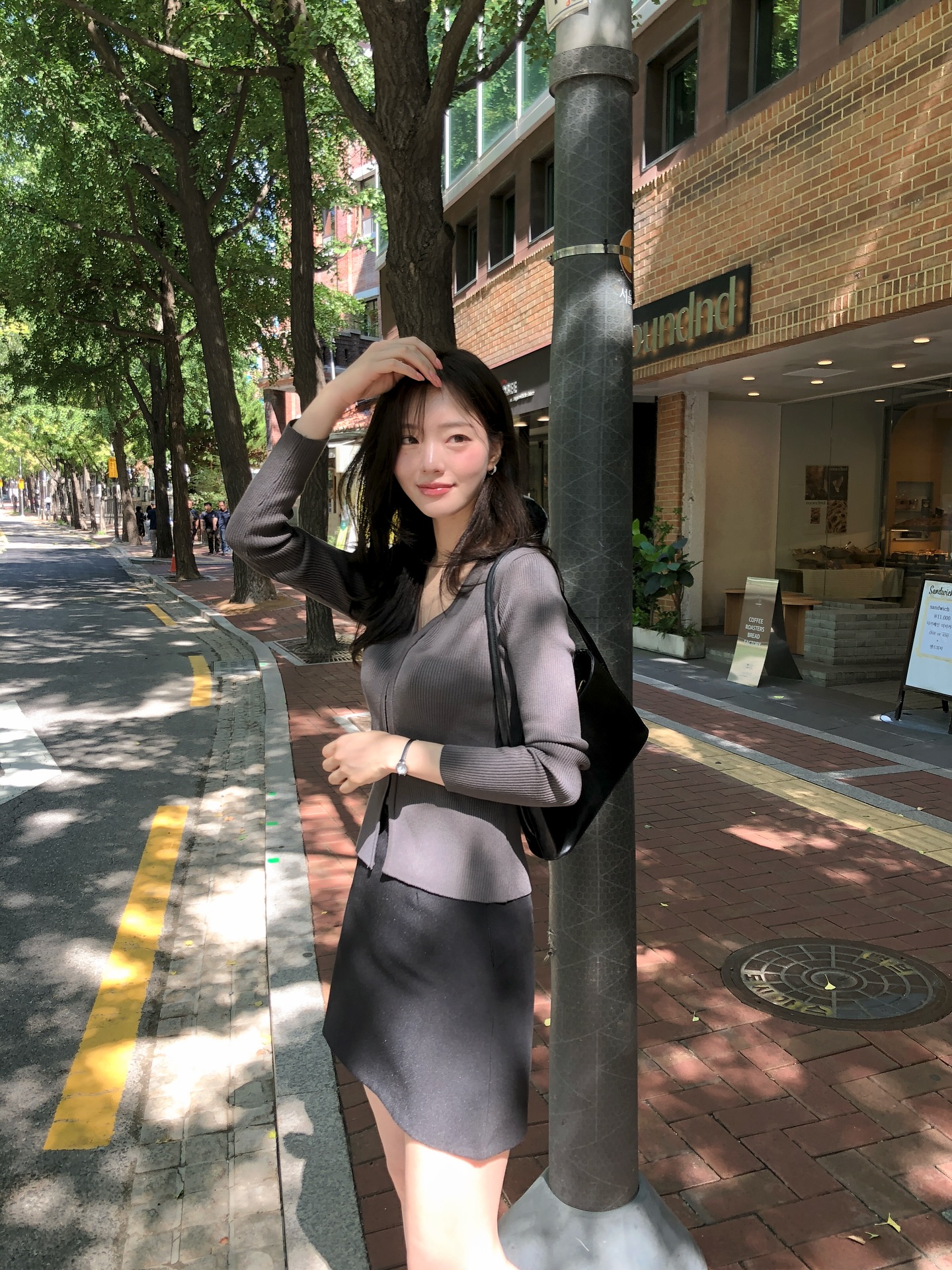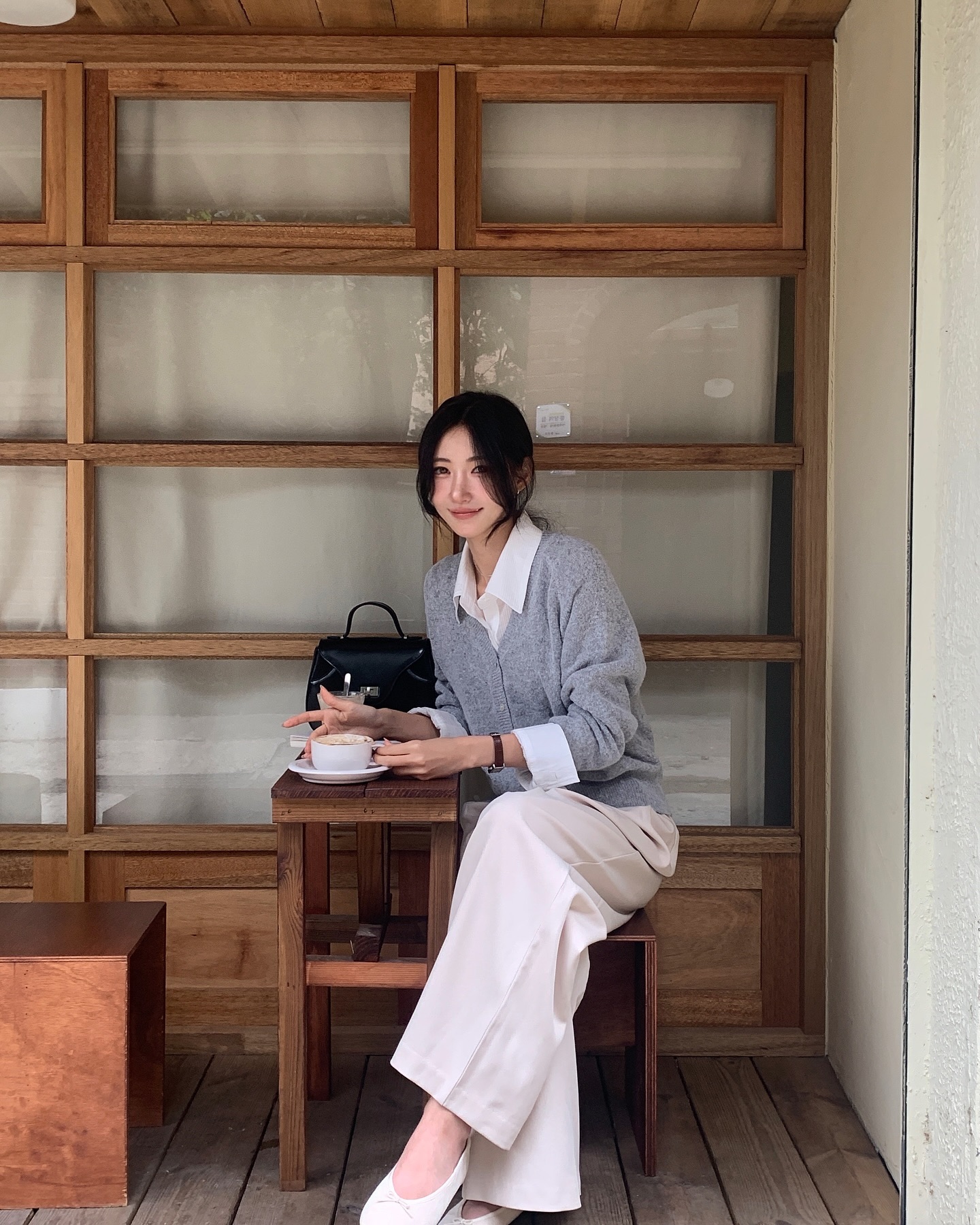 Layering cardigan bên ngoài sơ mi tạo hiệu ứng thị giác đẹp mắt, đồng thời cho phép bạn chơi đùa với màu sắc: cardigan tông be – sơ mi trắng; cardigan xám – sơ mi xanh nhạt; hoặc cardigan đen – sơ mi kẻ ô. Quần ống suông giúp outfit giữ được độ thanh thoát mà không bị rối mắt.