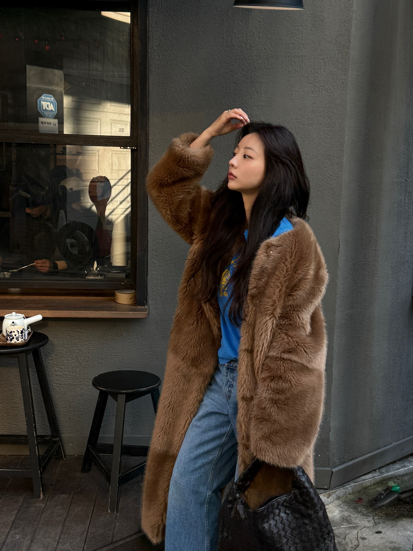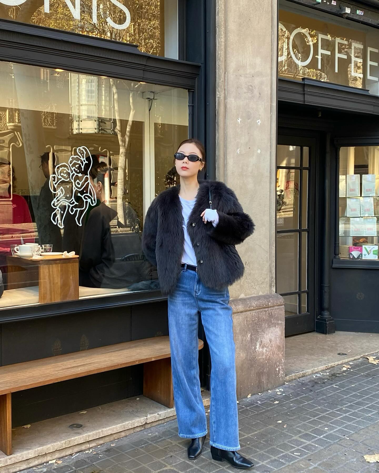 Quần jeans và áo khoác lông
