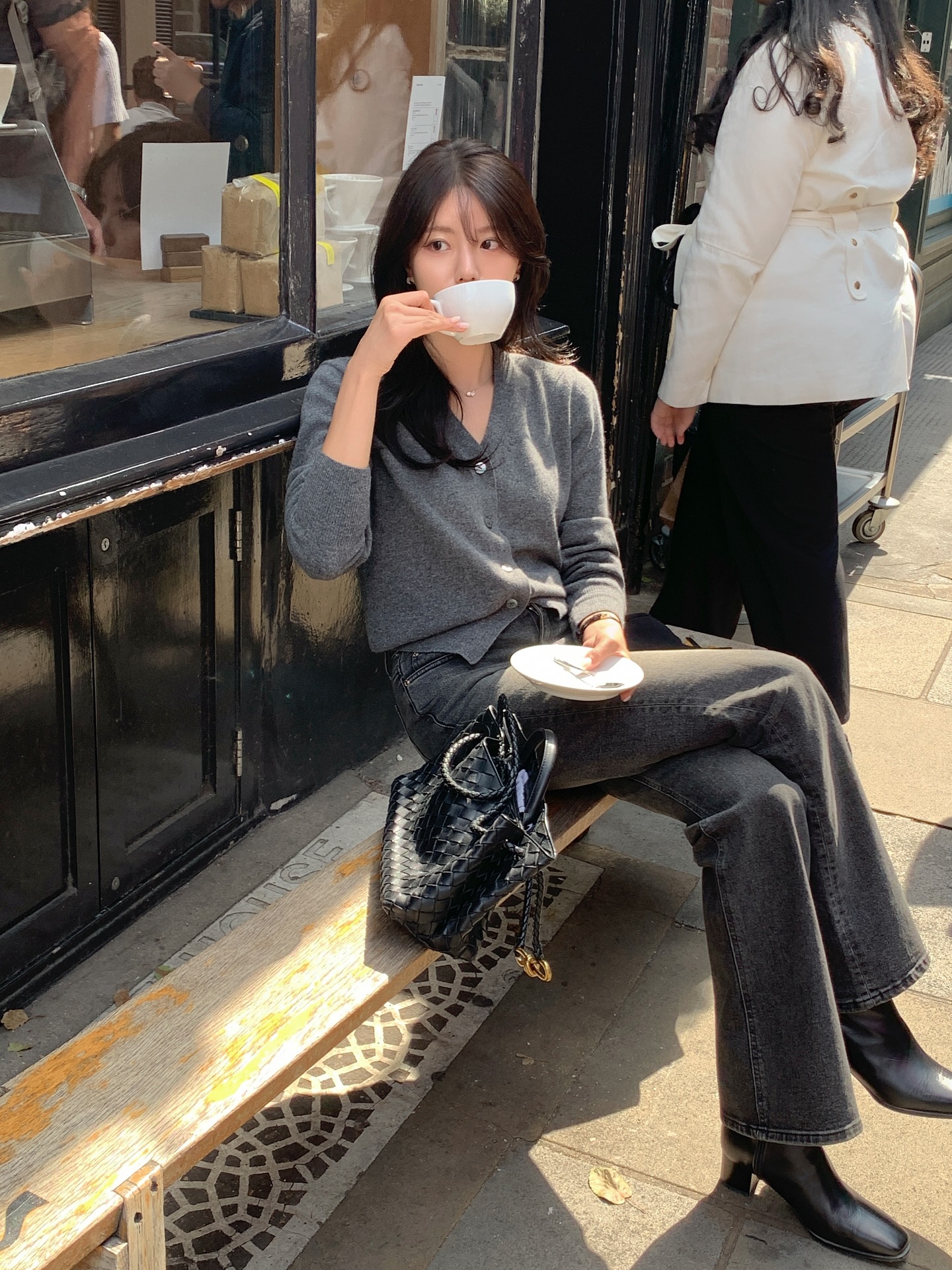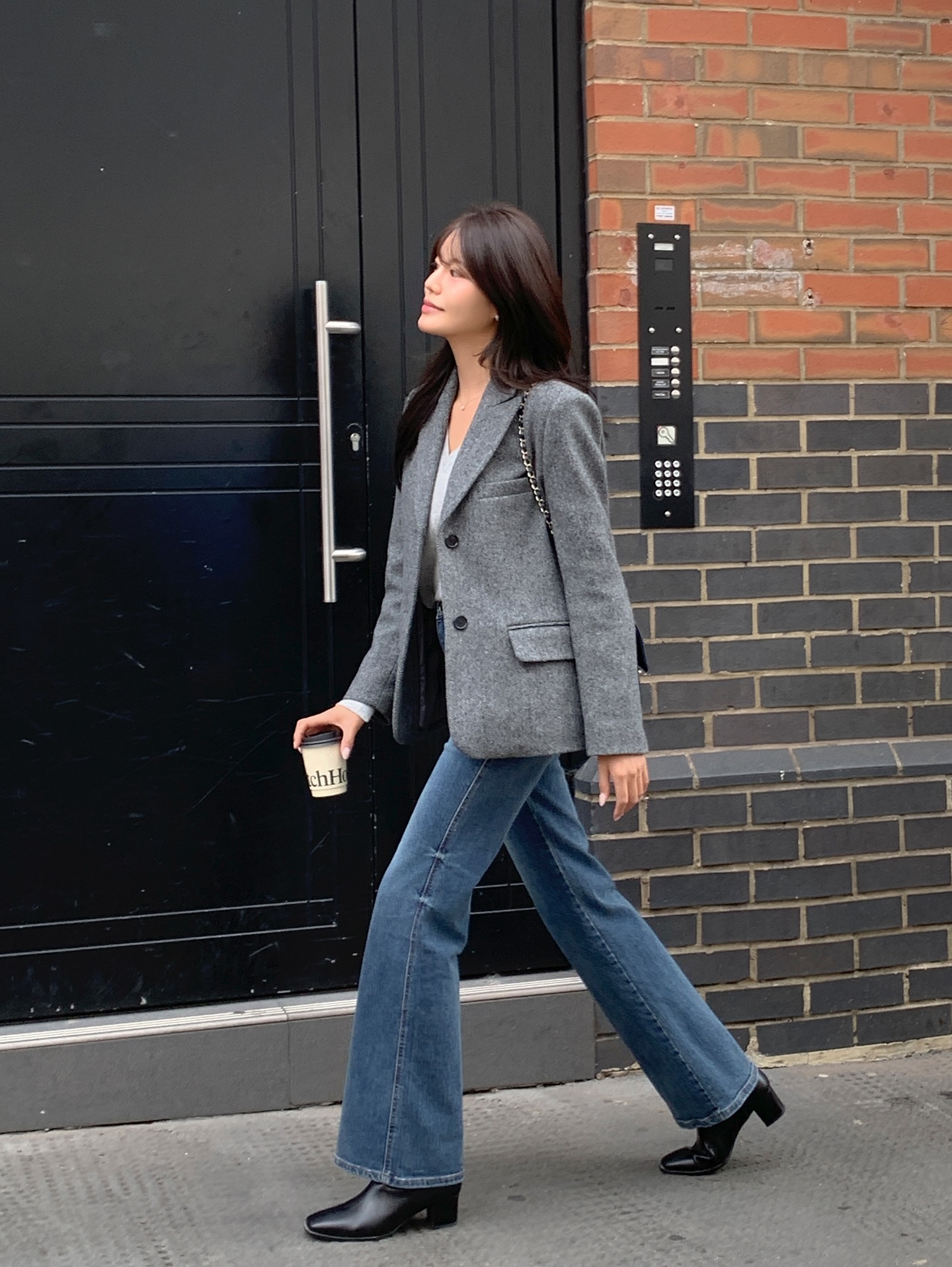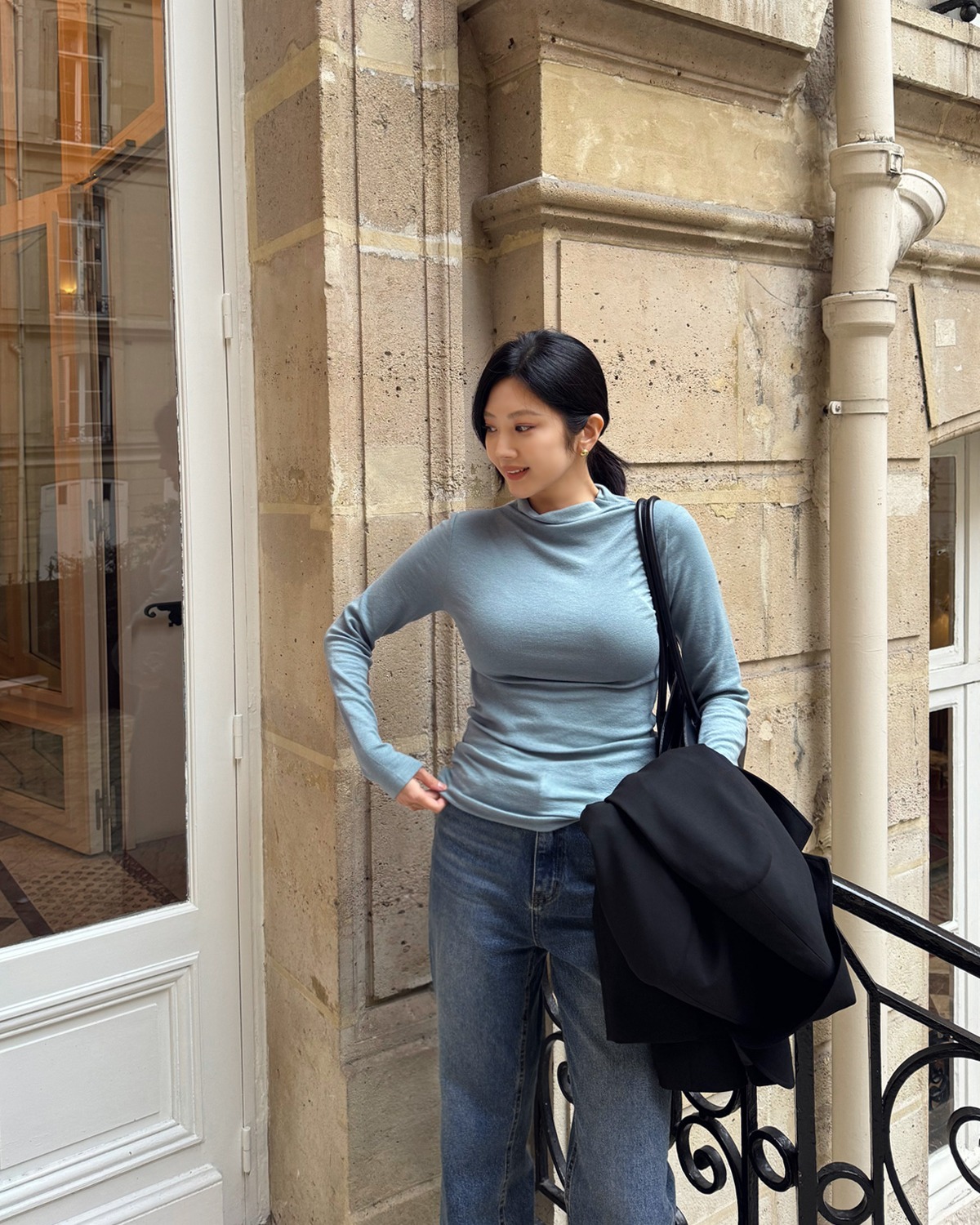 Quần jeans cạp cao sẽ giúp tôn dáng và tạo cảm giác chuyên nghiệp hơn so với jeans rách hay wash quá đậm. Cách phối này đặc biệt phù hợp vào những ngày thời tiết se lạnh, vừa thoải mái vừa giữ được hình ảnh chỉn chu.