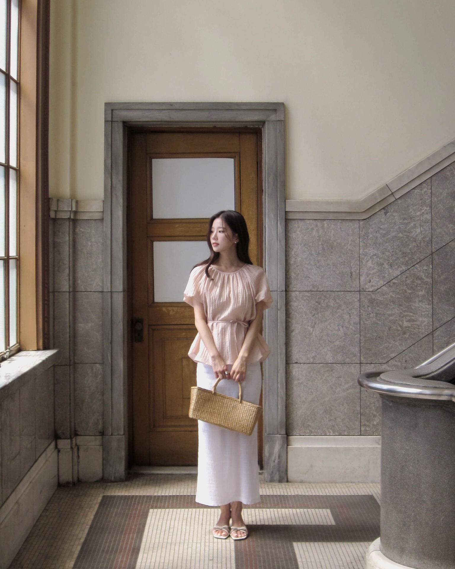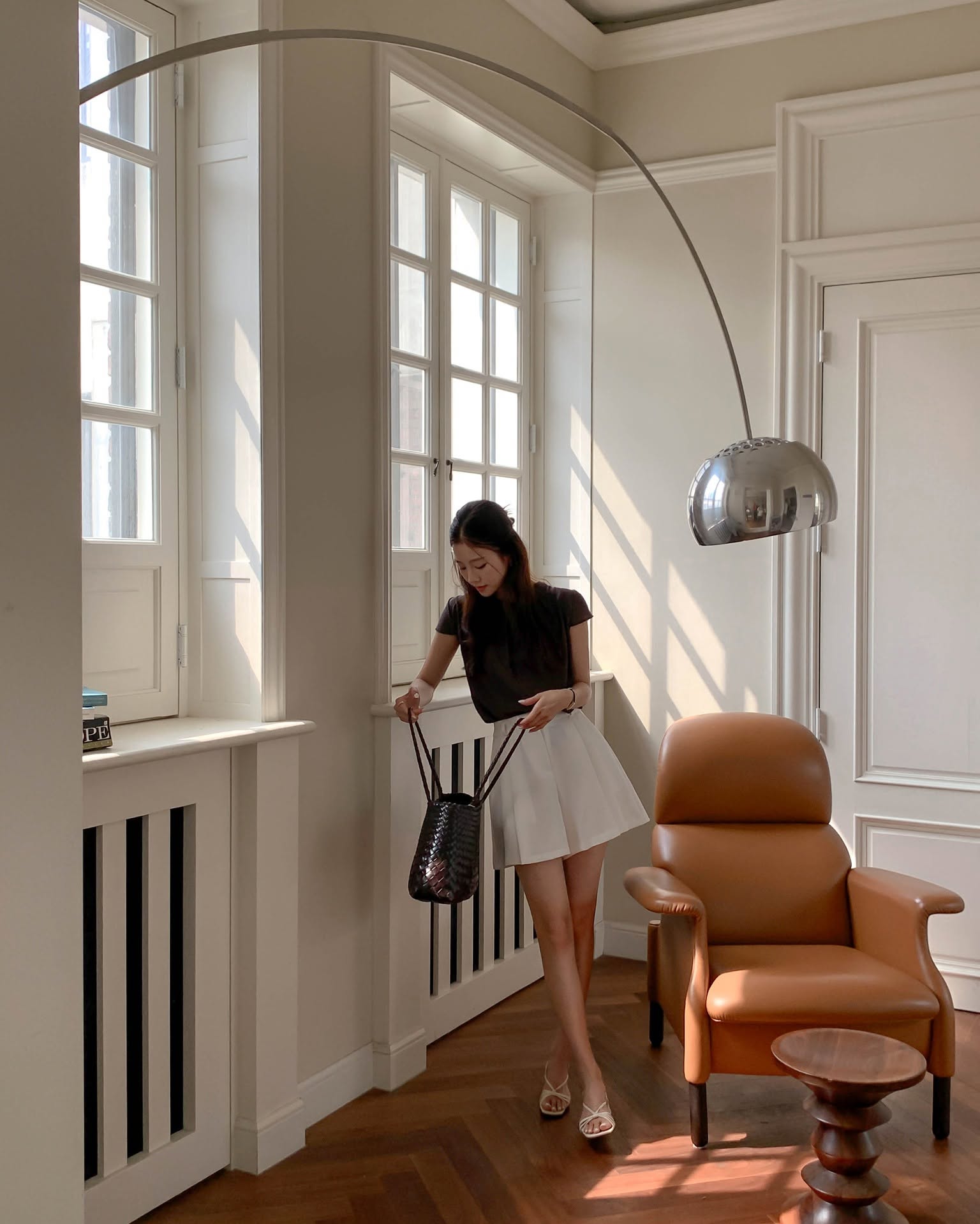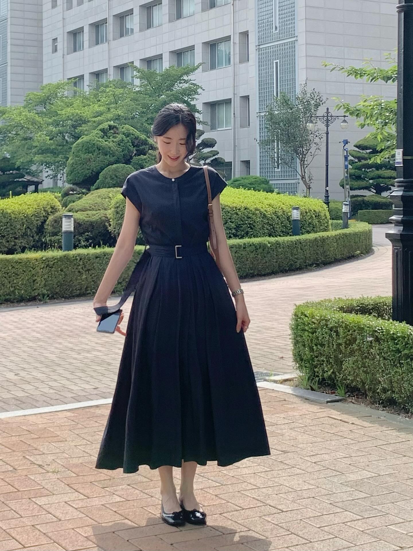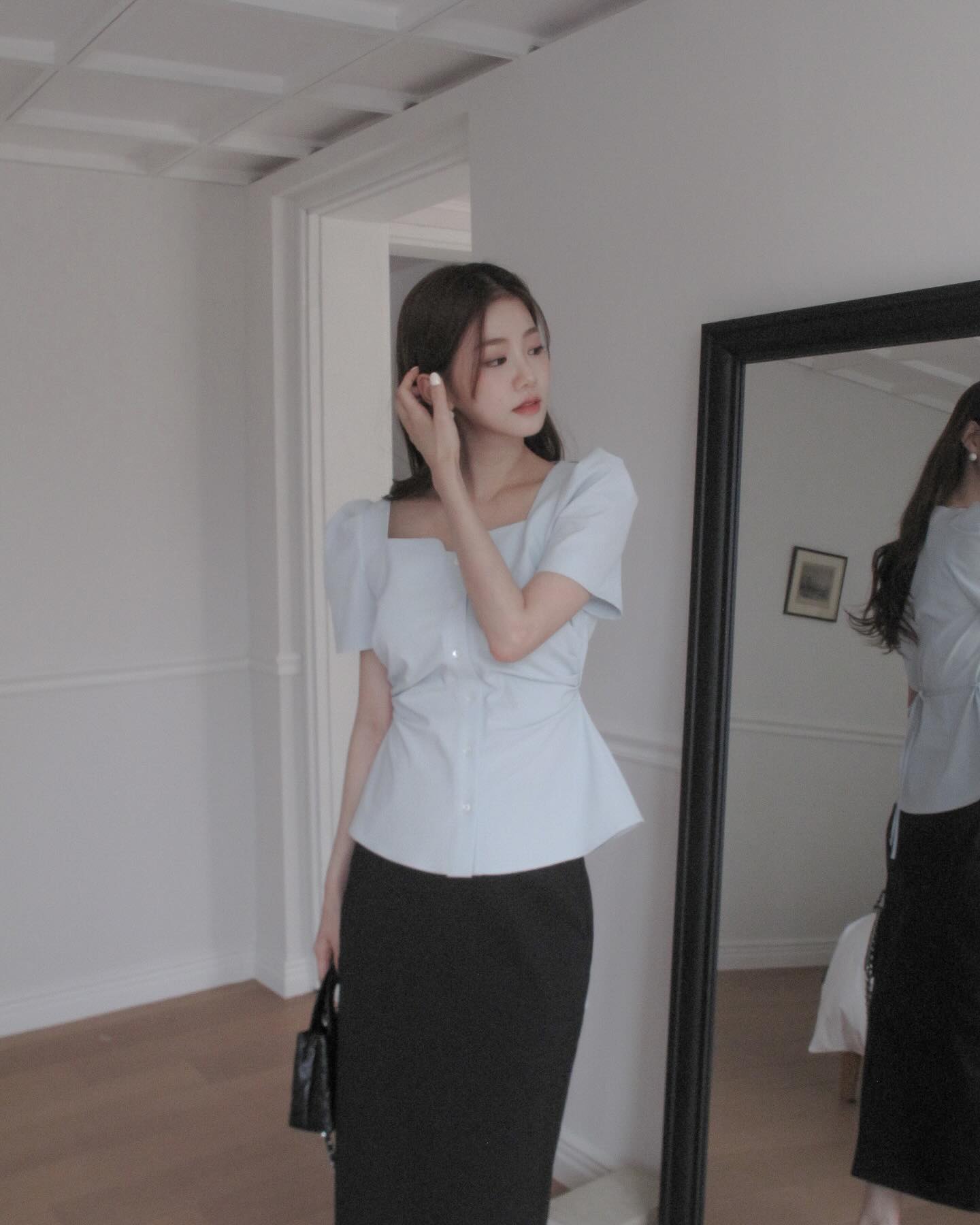 Ngoài ra, việc sơ vin áo gọn gàng vào trong chân váy cũng là một "chiêu" nhỏ nhưng cực kỳ hiệu quả để nâng cao tỷ lệ cơ thể. Một set đồ tối giản nhưng cân đối sẽ luôn mang lại cảm giác cao ráo và hiện đại.
