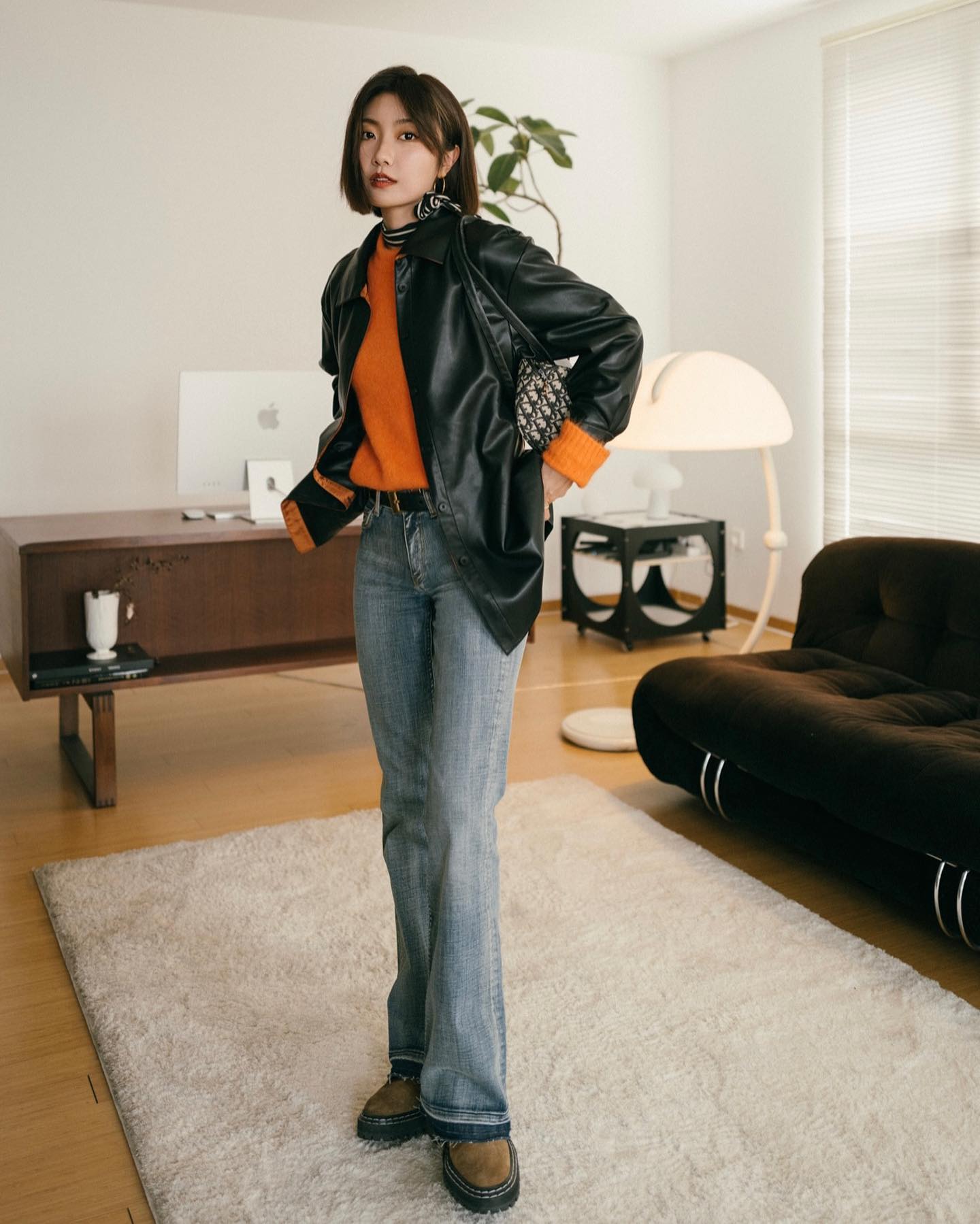 Áo khoác da mang đến vẻ ngoài mạnh mẽ, cá tính và có chút bụi bặm, đặc biệt khi kết hợp cùng áo len. Sự mềm mại của áo len và chất liệu cứng cáp của da tạo nên sự tương phản thú vị, giúp set đồ trở nên ấn tượng hơn.
