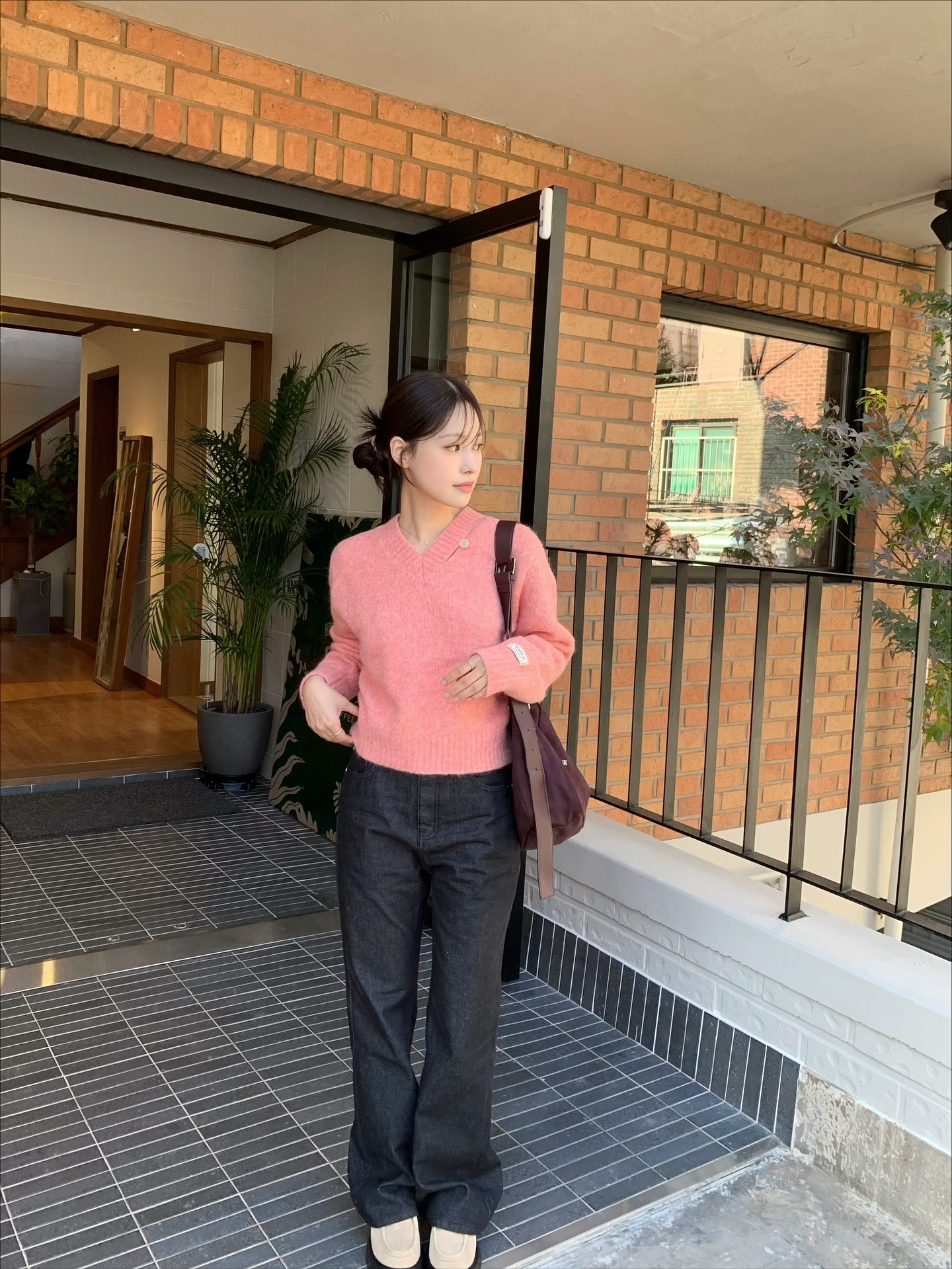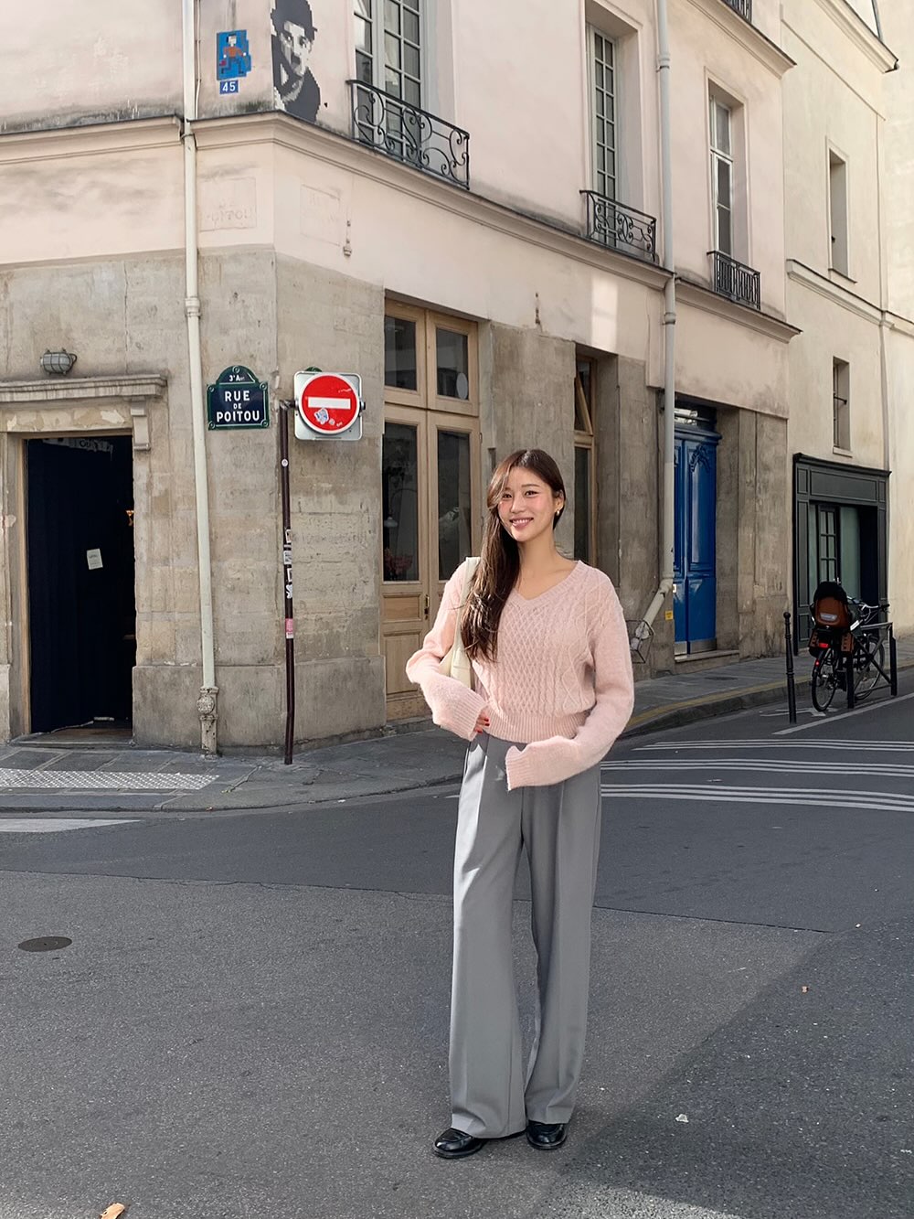 Áo len cổ chữ V là món đồ kinh điển của mùa đông và đặc biệt hợp với quần ống rộng. Chi tiết cổ chữ V giúp phần cổ và vai trông thanh thoát hơn, đồng thời tạo cảm giác cân đối cho tổng thể trang phục.
