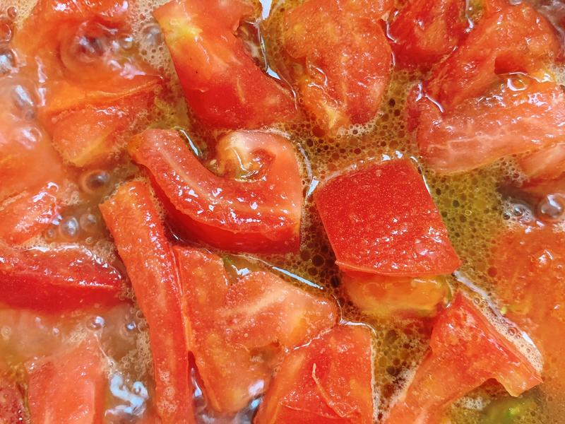 Bạn có thể nấu món canh này dễ dàng theo kiểu "nhắm mắt cũng làm được". Lấy hai quả cà chua chín, khía hình chữ thập trên đầu, chần qua nước sôi để bóc vỏ, rồi thái hạt lựu. Cho một ít dầu vào nồi, phi thơm gừng thái lát, sau đó cho cà chua đã thái hạt lựu vào. Bước này rất quan trọng - dùng thìa ấn cà chua xuống trong khi xào cho đến khi chúng nhuyễn thành dạng sệt và tiết ra tinh dầu màu đỏ; điều này sẽ giúp súp có màu sắc đẹp và đậm đà. Sau đó, thêm nước sôi vừa đủ vào rồi đun sôi trên lửa lớn.