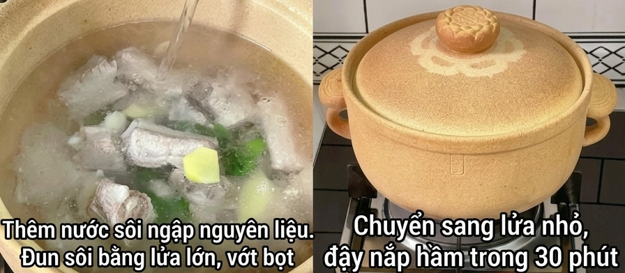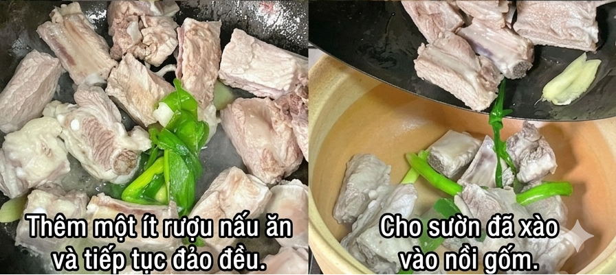 Bước 2: Sau đó bạn thêm một chút rượu nấu ăn vào, đảo đều. Sau đó cho sườn heo đã xào vào nồi gốm. Sau đó thêm lượng nước sôi ngập mặt sườn. Đun sôi trên lửa lớn sau đó dùng muôi vớt sạch bọt rồi đậy nắp nồi và ninh ở lửa nhỏ trong khoảng 30 phút.