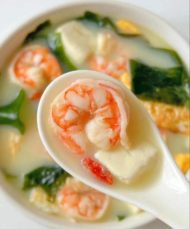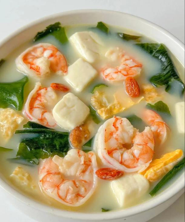 Rong biển Wakame, tôm và đậu phụ đều là những nguồn tự nhiên giàu canxi; kết hợp các nguyên liệu này sẽ tăng gấp đôi giá trị dinh dưỡng. Món ăn tươi ngon, nhẹ nhàng và dễ hấp thụ, bổ sung hiệu quả lượng canxi cần thiết cho sức khỏe xương, thúc đẩy sự phát triển của trẻ em và duy trì sức khỏe xương cho người cao tuổi.