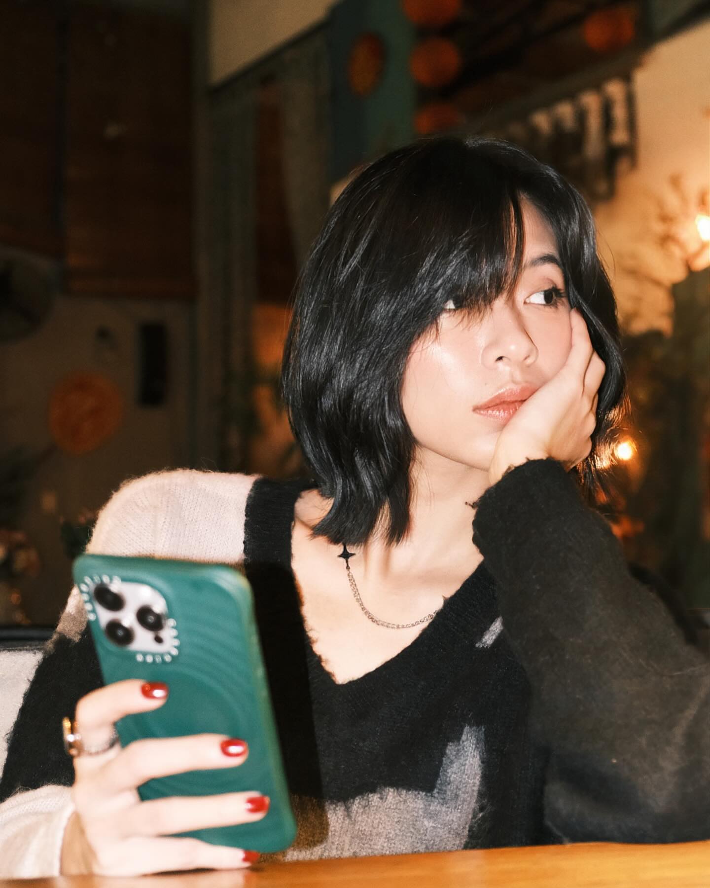 Đồng Ánh Quỳnh lại mang đến cảm giác hoàn toàn khác. Mái tóc ngắn layer kết hợp mái thưa giúp cô giữ được vẻ phóng khoáng, tự nhiên, nhưng không hề quá gai góc. Kiểu tóc này tạo cảm giác nhẹ nhàng, dễ gần, đồng thời vẫn đủ cá tính để vẫn nổi bật giữa đám đông.