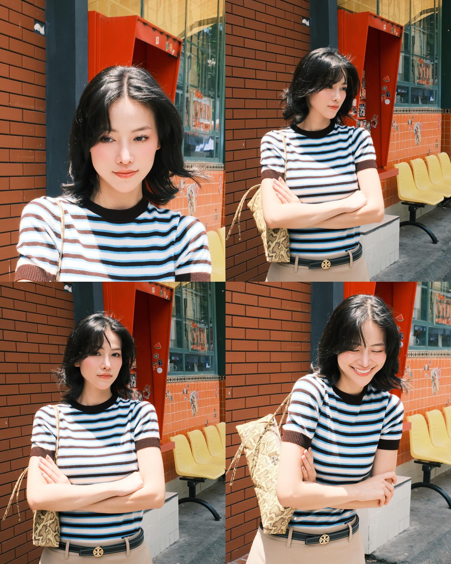 Trâm Anh lại ghi điểm với kiểu tóc bob hớt ngôi lệch, mang đến cảm giác yêu kiều nhưng vẫn hiện đại. Tóc bob vốn là kiểu tóc quen thuộc, nhưng khi được hớt ngôi lệch, gương mặt trông thanh thoát và mềm mại hơn. Kiểu tóc này giúp Trâm Anh dễ dàng thay đổi phong cách, từ nhẹ nhàng, nữ tính đến trưởng thành, chững chạc. Không cần quá nhiều chi tiết, mái tóc bob của cô vẫn tạo được dấu ấn riêng nhờ sự gọn gàng và tinh tế.