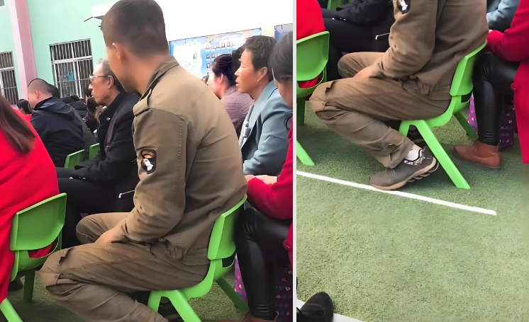 Bức ảnh được chụp trong buổi họp phụ huynh ở một trường mầm non tại Trung Quốc. Nhân vật chính trong ảnh là một người bố xuất hiện với bộ quần áo lao động cũ kỹ, nhăn nhúm, dính bụi bẩn và nhiều vết sờn. Giữa căn phòng nơi phần lớn phụ huynh ăn mặc gọn gàng, lịch sự, sự xuất hiện của người đàn ông này lập tức trở nên nổi bật theo cách không mong muốn.