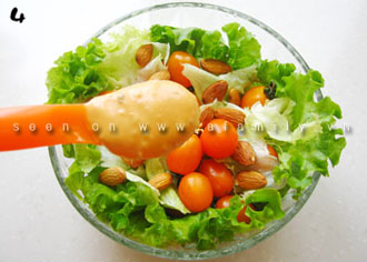 Bước 4: Cho một muỗng canh hỗn hợp trộn lên mặt tô trộn cho đẹp mắt, phần còn lại để nguyên trong bát nhỏ để ăn kèm khi dùng. Nếu ăn ngay hay muốn thưởng thức món salad đậm đà hơn thì bạn có thể trộn trực tiếp toàn bộ chỗ sốt vào tô salad cho rau quả quyện và thấm đều. |